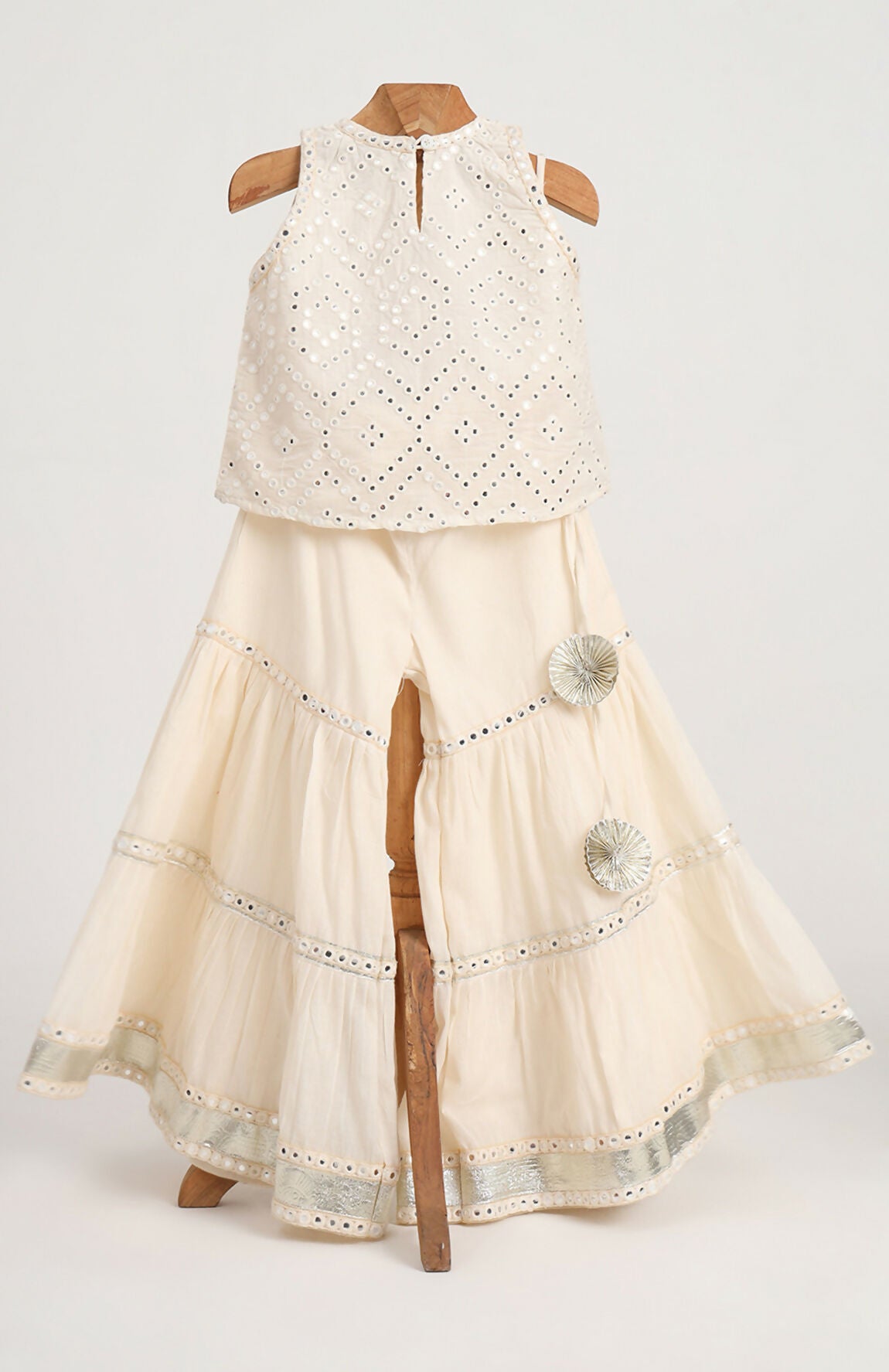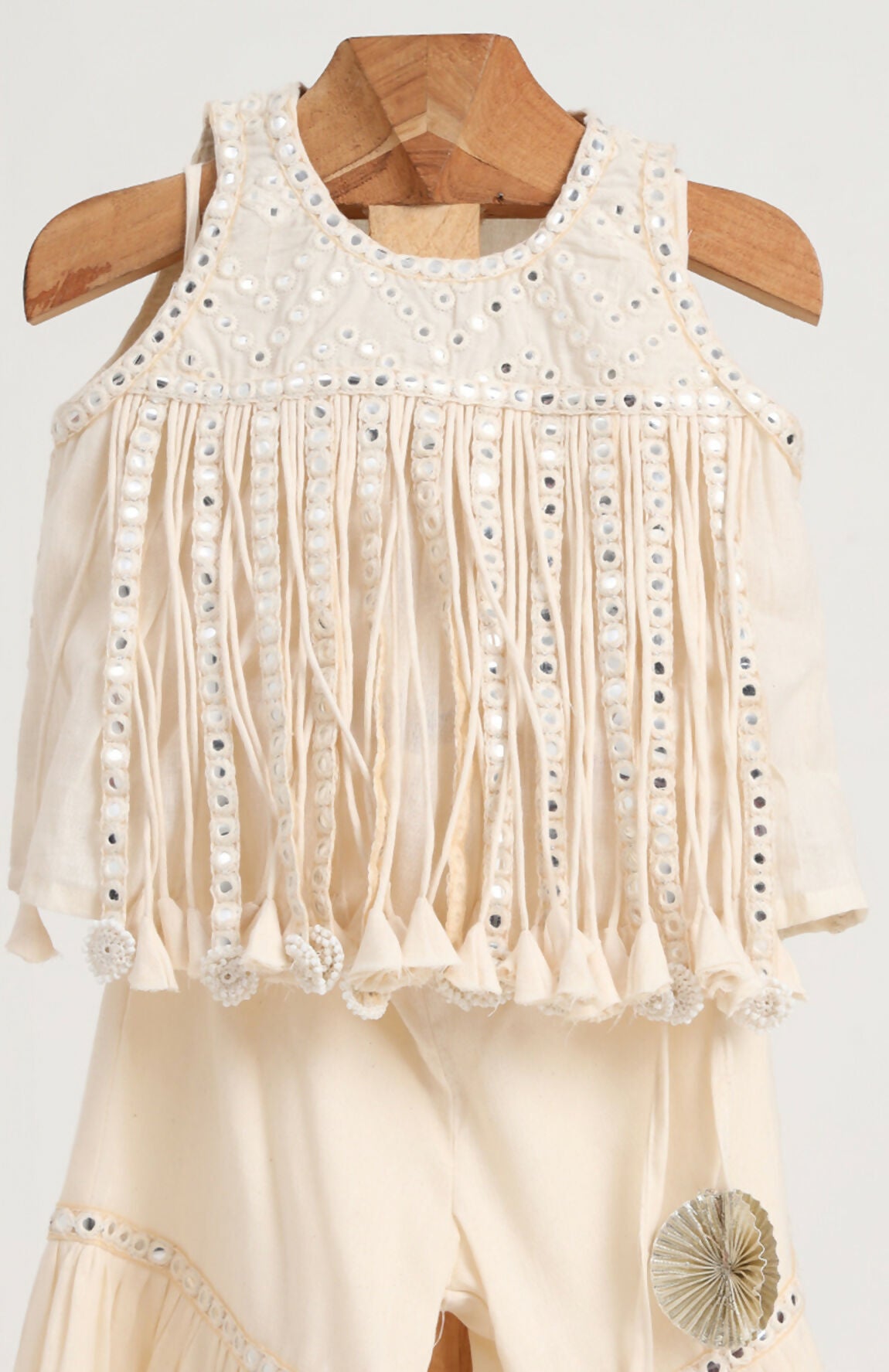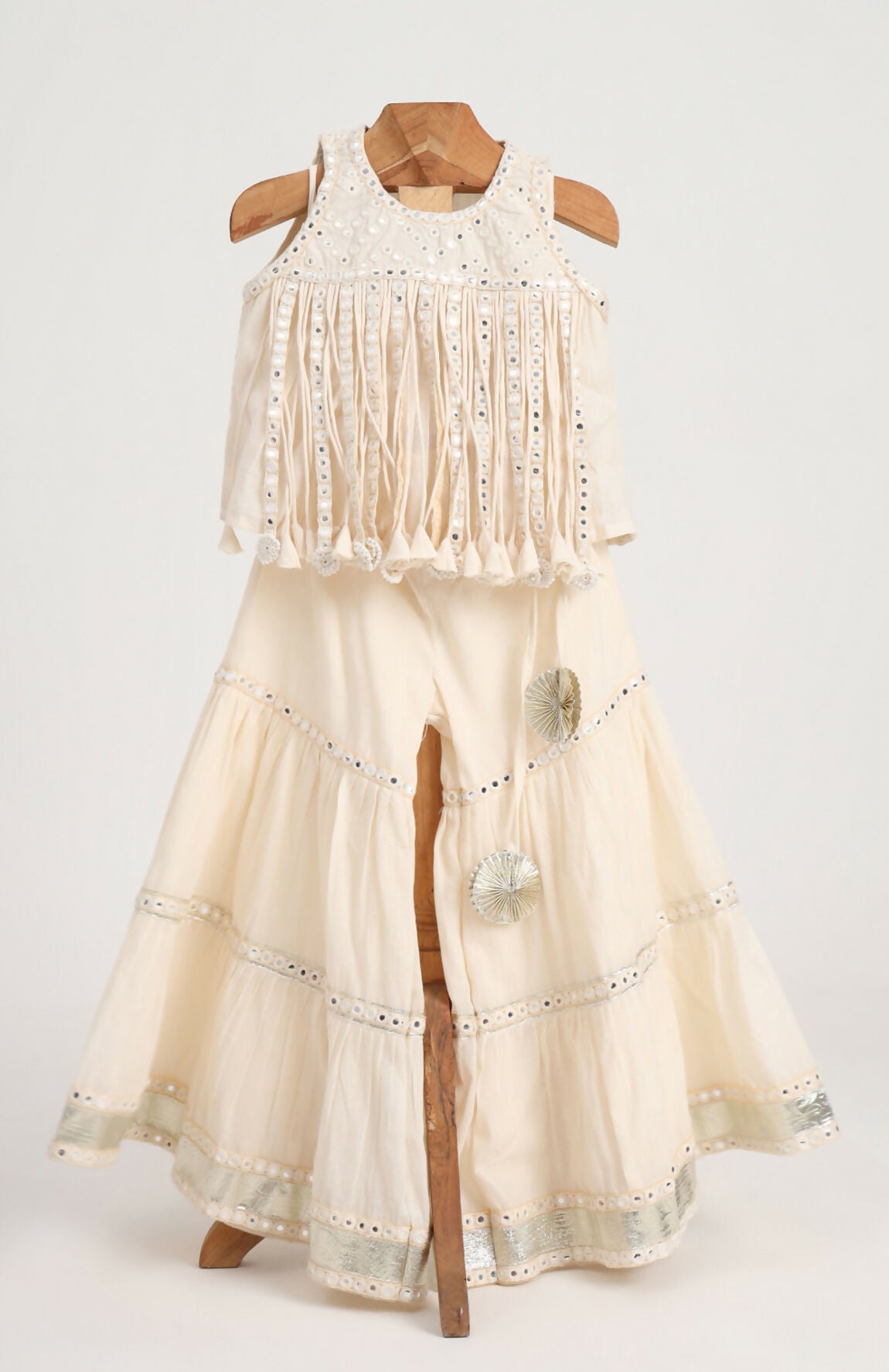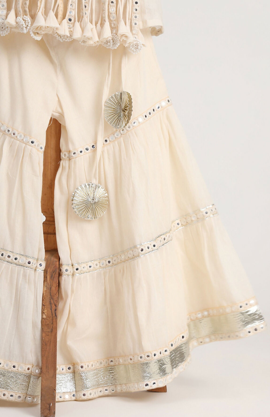 Kora Cotton Choli with Faux Mirror Embroidery embellished with Tassels paired with a Kora Cotton 3 layer Sharara