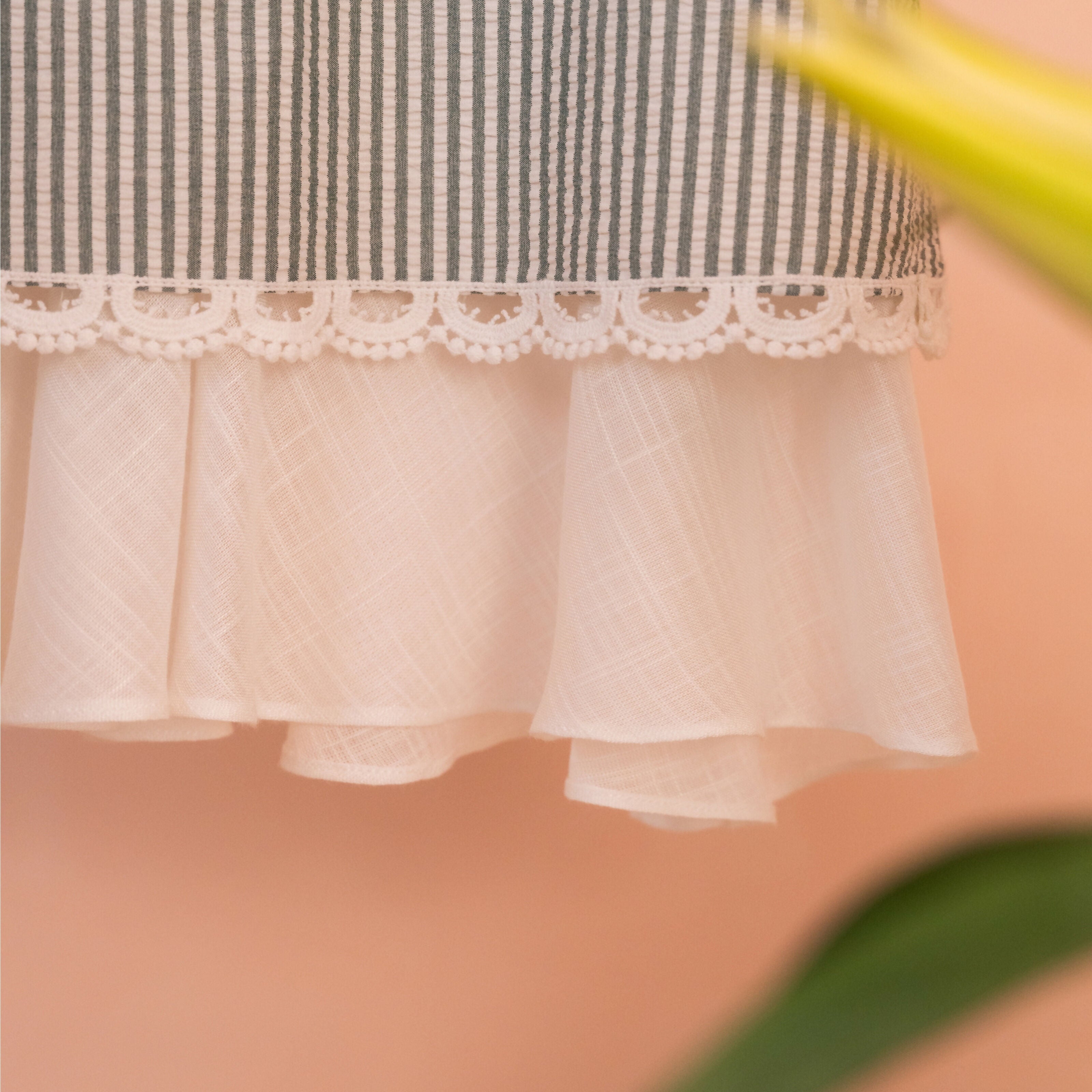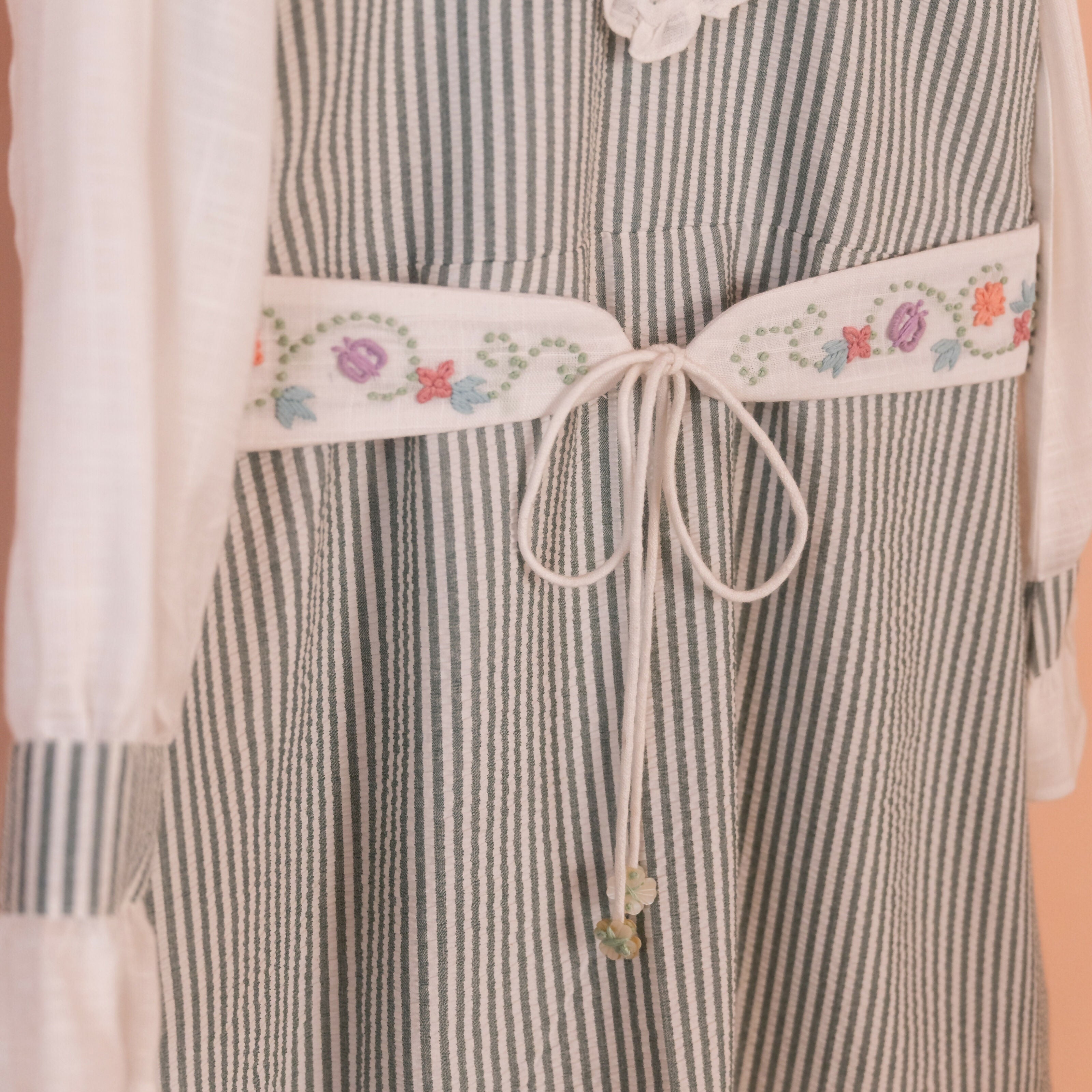 This elegant girls' dress features a green and white vertical striped pattern with soft white full sleeves and ruffled cuffs. Finished with a dainty frilled neckline and a matching striped bow. This is a made-to-order product. It will take approximately 10 to 12 days to manufacture, and an additional 7 to 10 business days for delivery.
