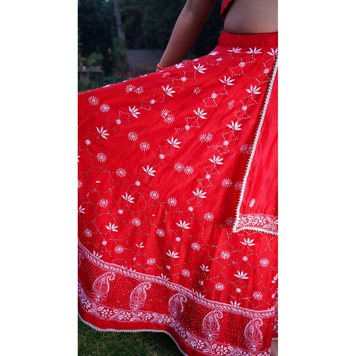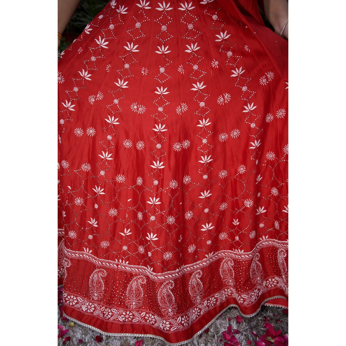 A stunning bright red chanderi lehenga hand-embroidered with delicate chikankari lotuses and adorned with beautiful mukaish work. This statement piece celebrates timeless craftsmanship - radiant, intricate and made to turn every twirl into poetry.