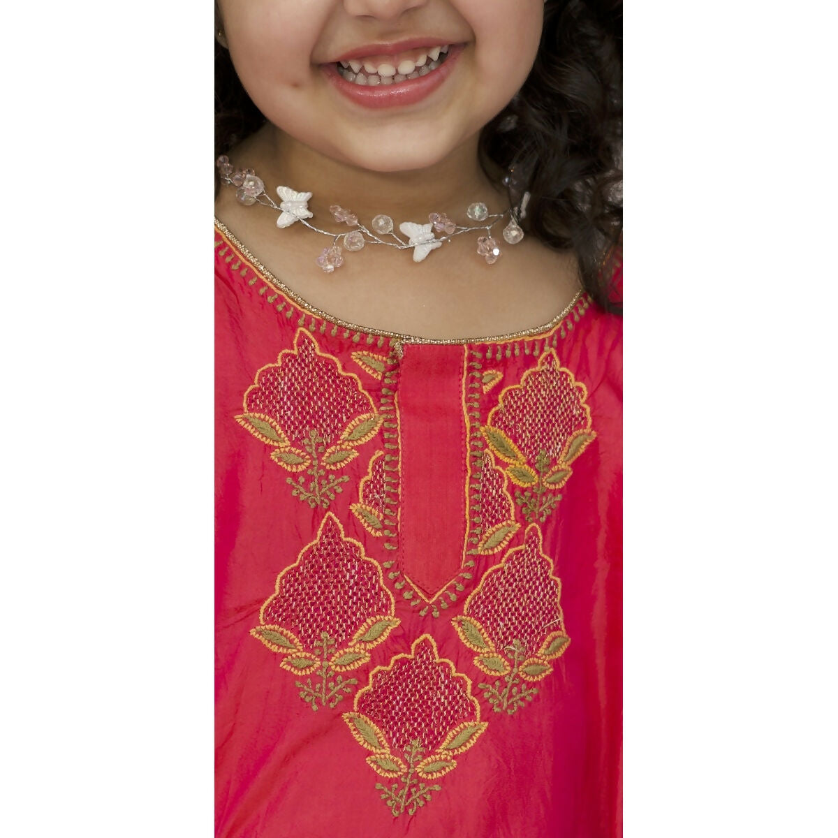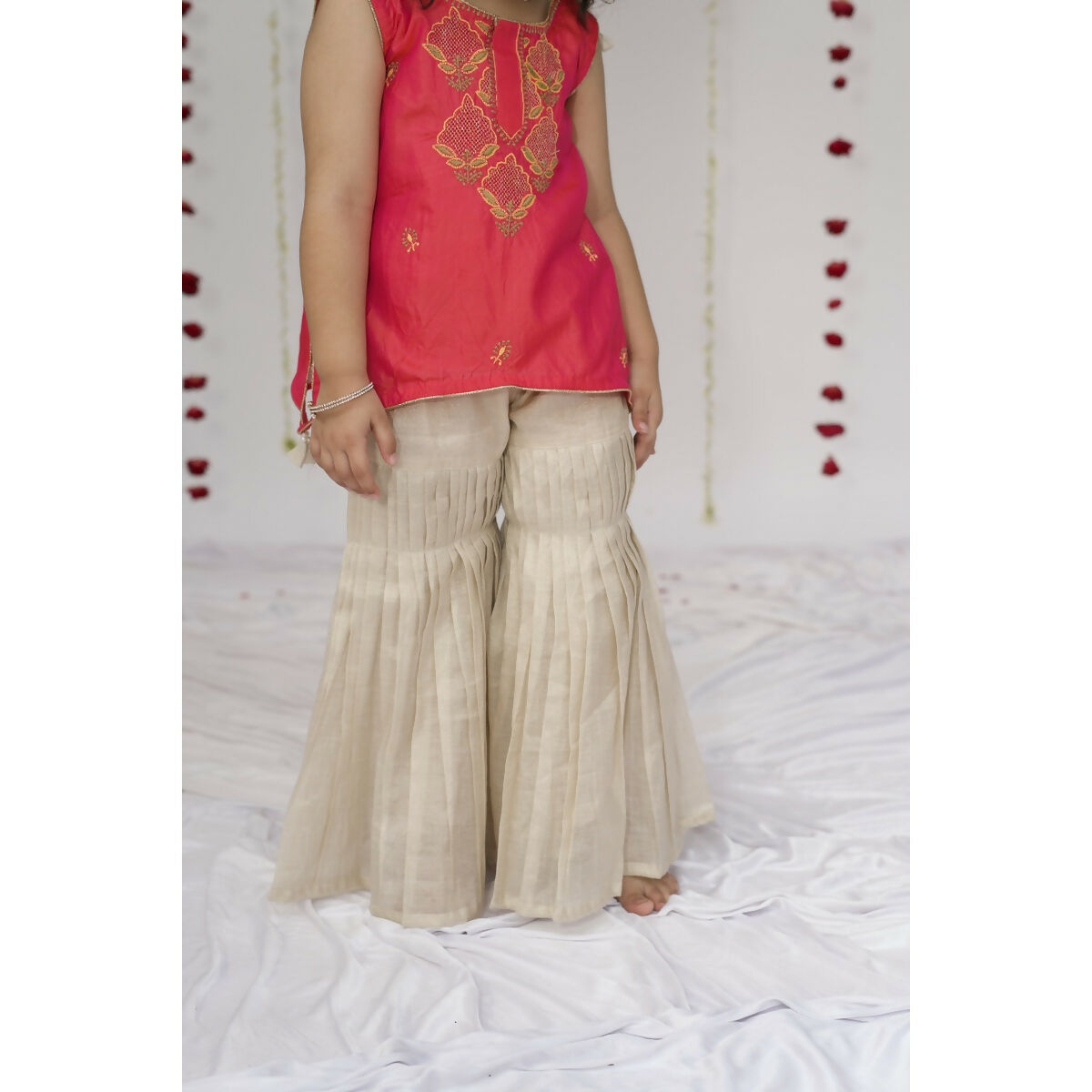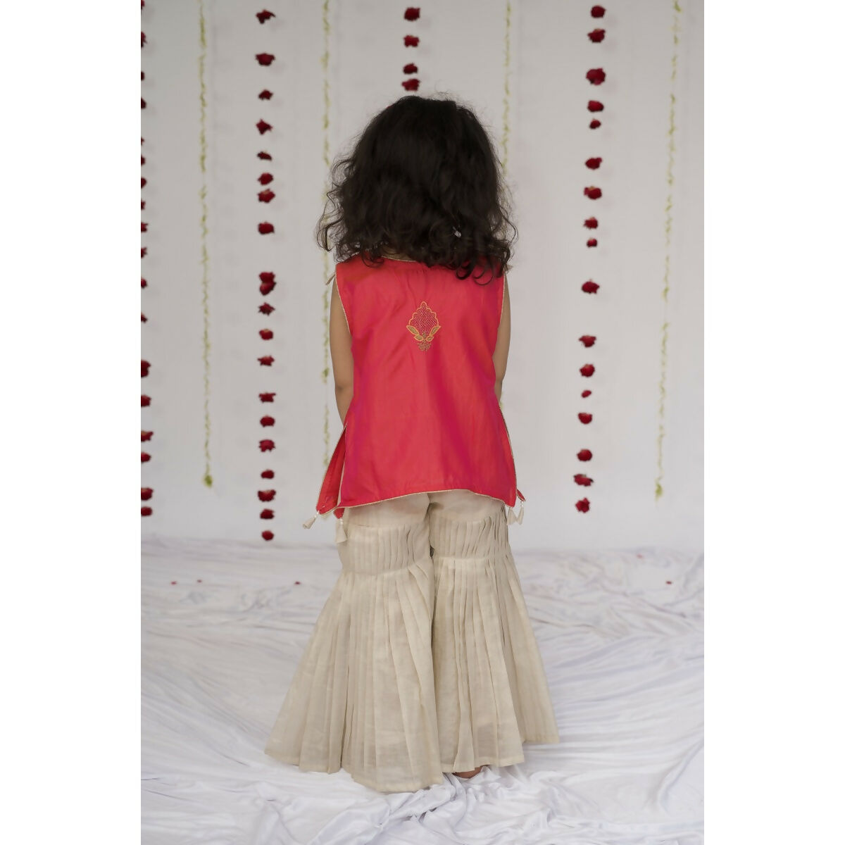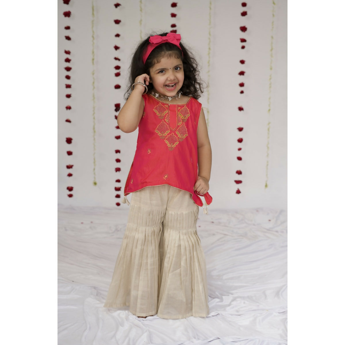 A sharming pink short silk kurta featuring an inverted U hemline and delicate chikankari motifs completed with silver kasab thread. Paired with a golden sharara, this set blends playful charm for festivities. This is a made-to-order product. It will take approximately 10 to 12 days to manufacture, and an additional 7 to 10 business days for delivery.
