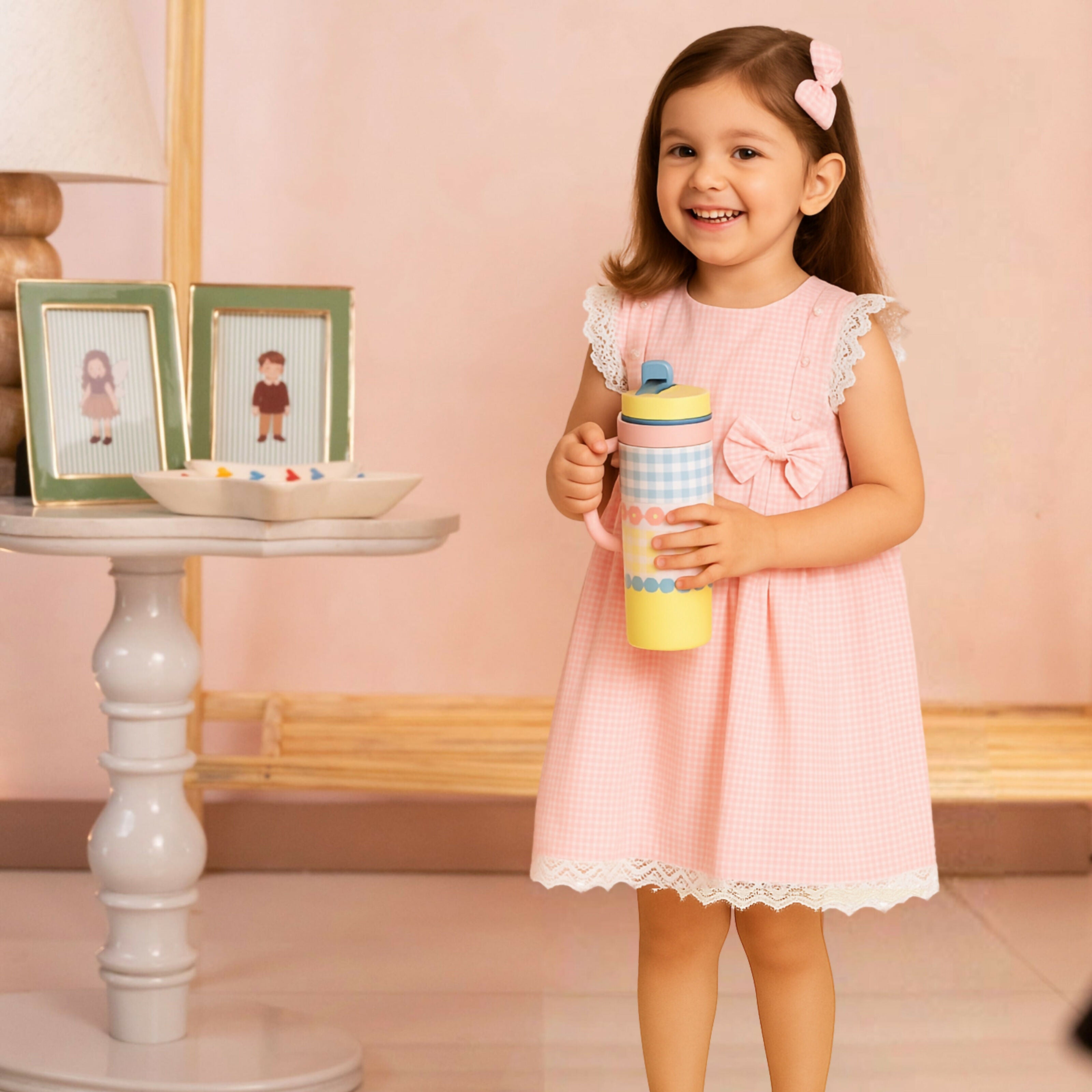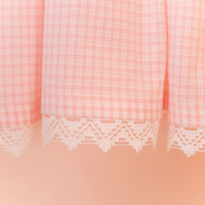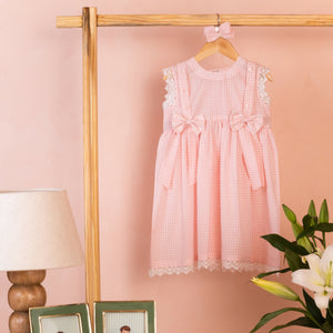 This pastel pink checked dress features delicate floral embroidery, lace-trimmed sleeves, and two charming bows at the waist. Soft, breathable cotton fabric and a flowy silhouette make it perfect for a sweet and elegant look. This is a made-to-order product. It will take approximately 10 to 12 days to manufacture, and an additional 7 to 10 business days for delivery.