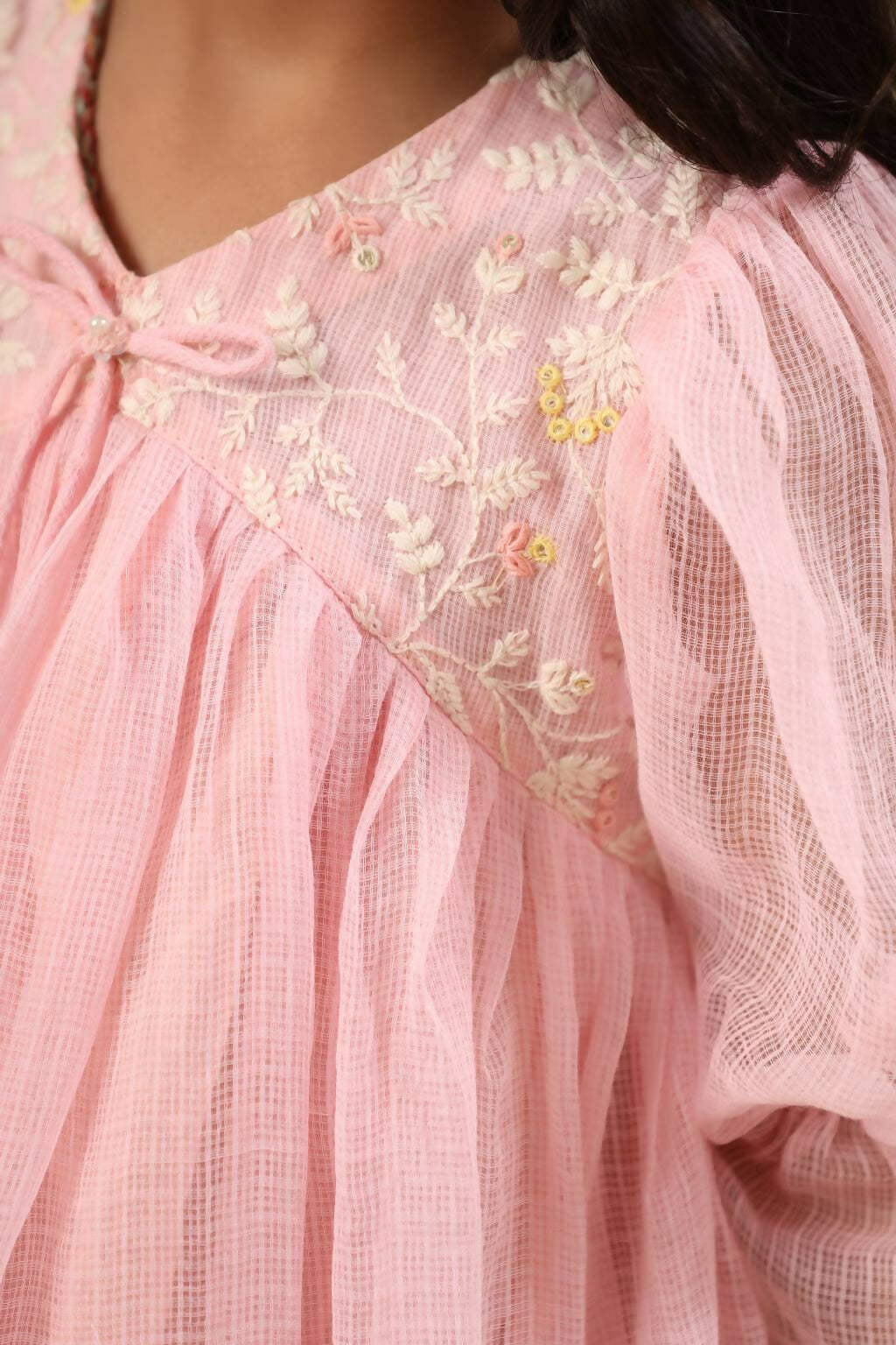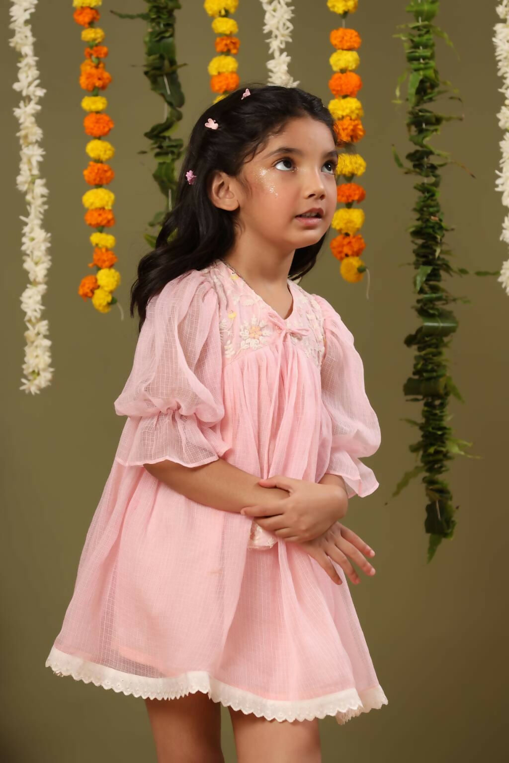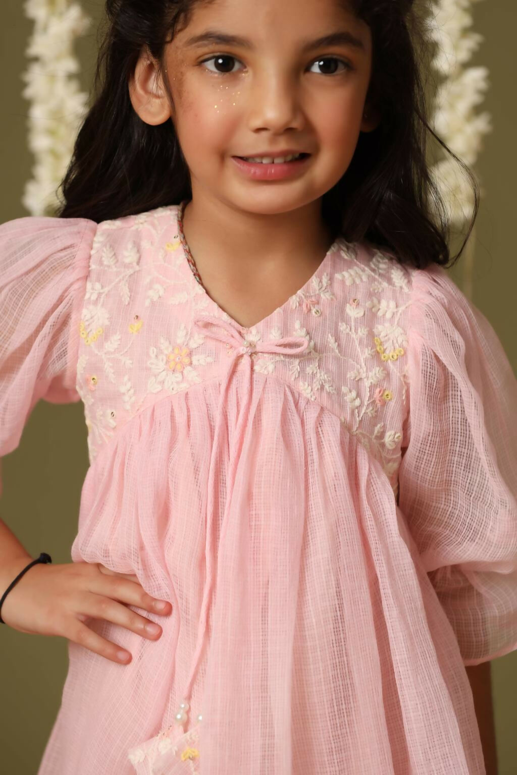 This is a comfortable festive wear for upcomin festive seaon . Outfit with elegant embroidery on top and laces used to enhance the overall look. Elbow puff sleeves