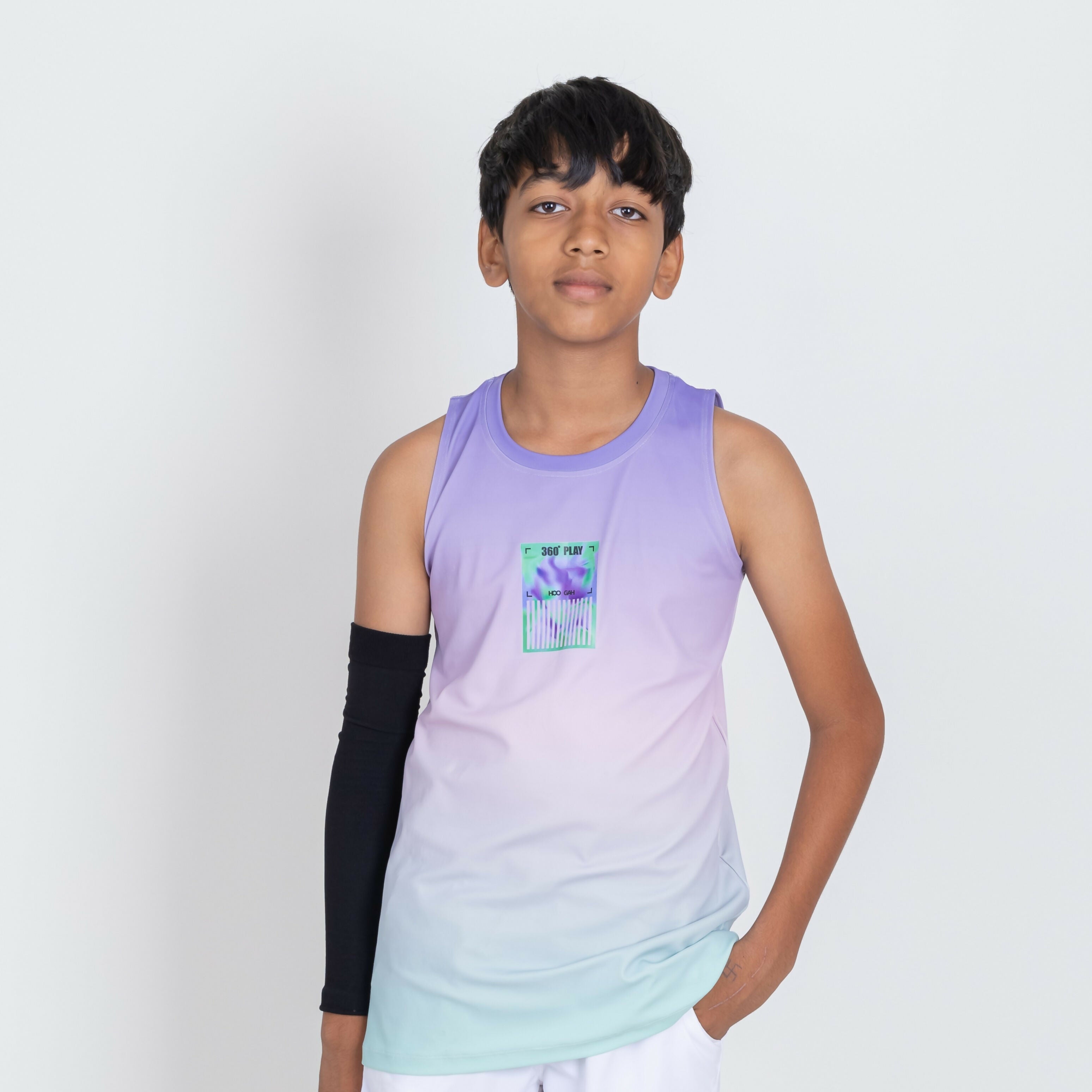1.Designed for active boys andideal for tennis, badminton, gymnastics, athletics, and yoga.2.Relaxed fit with bold HOOGAH branding for confident, sporty style.3.A standout activewear essential symbolizing confidence and athleticism.4.Stylish ombre tank top in vibrant purple.