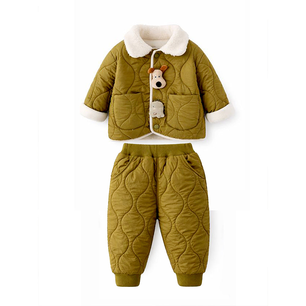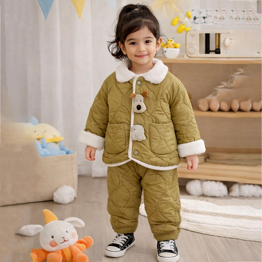 2 Pcs Olive Quilted Puffer Winter Jacket with Pants Co-ords set for Kids
