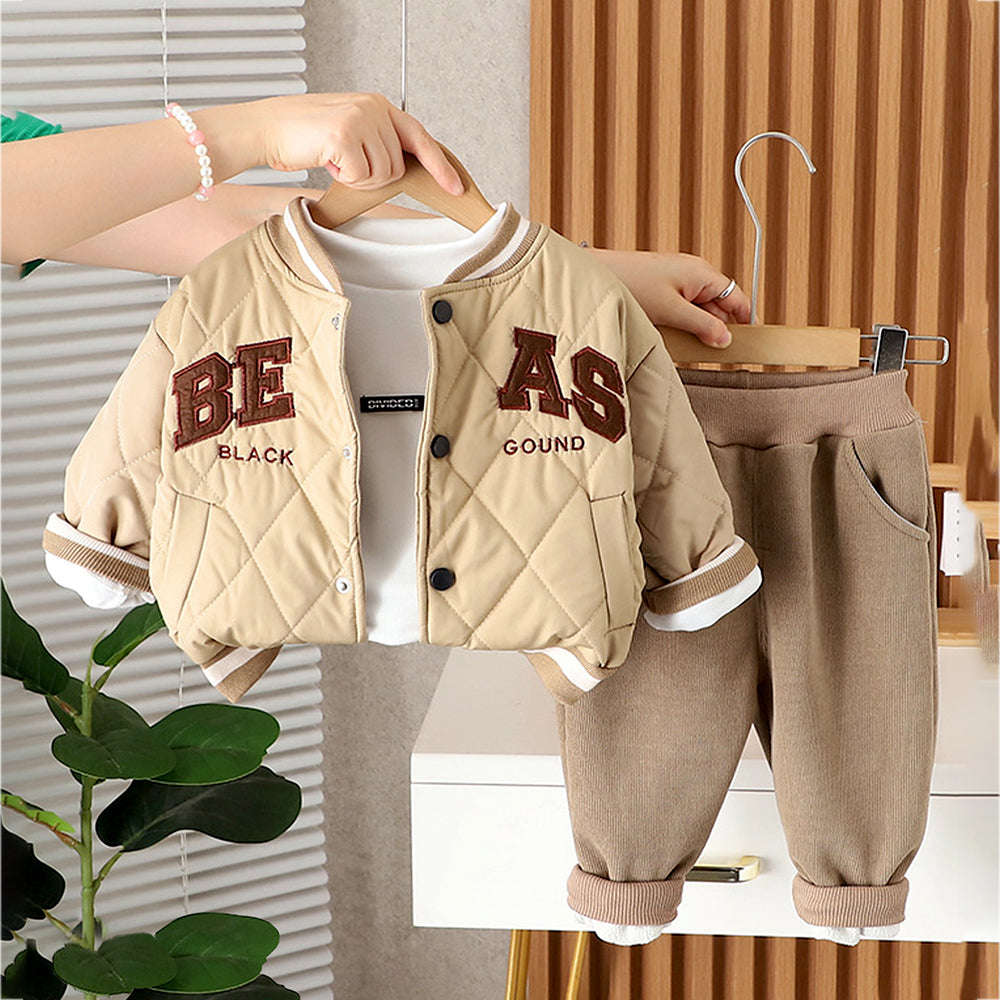 3 Pcs Set, Beige beas Puffer Quilted Jacket, with T-shirt & Pants for Kids, Winterwear