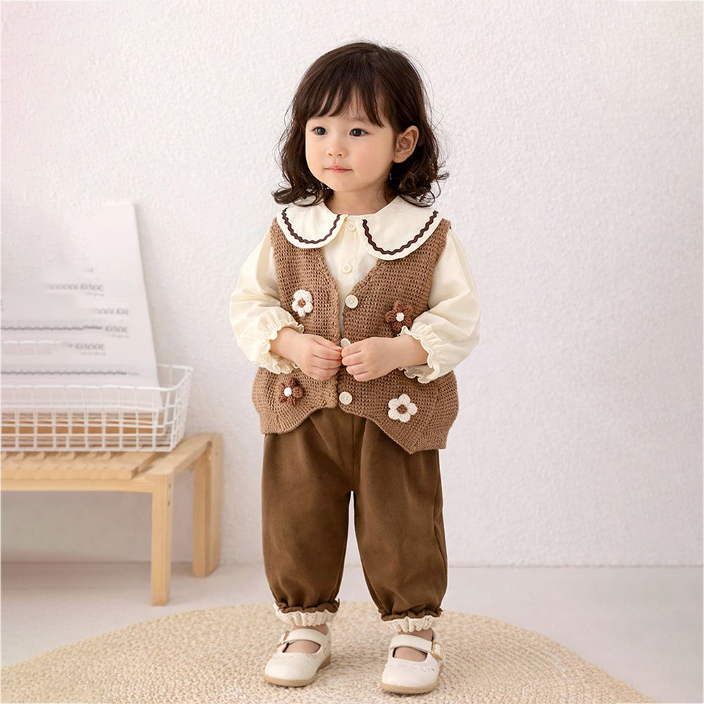 3 Pcs Set Brown crochet Knitted Vest,with White Shirt & Matching Pants Partwear set for Kids