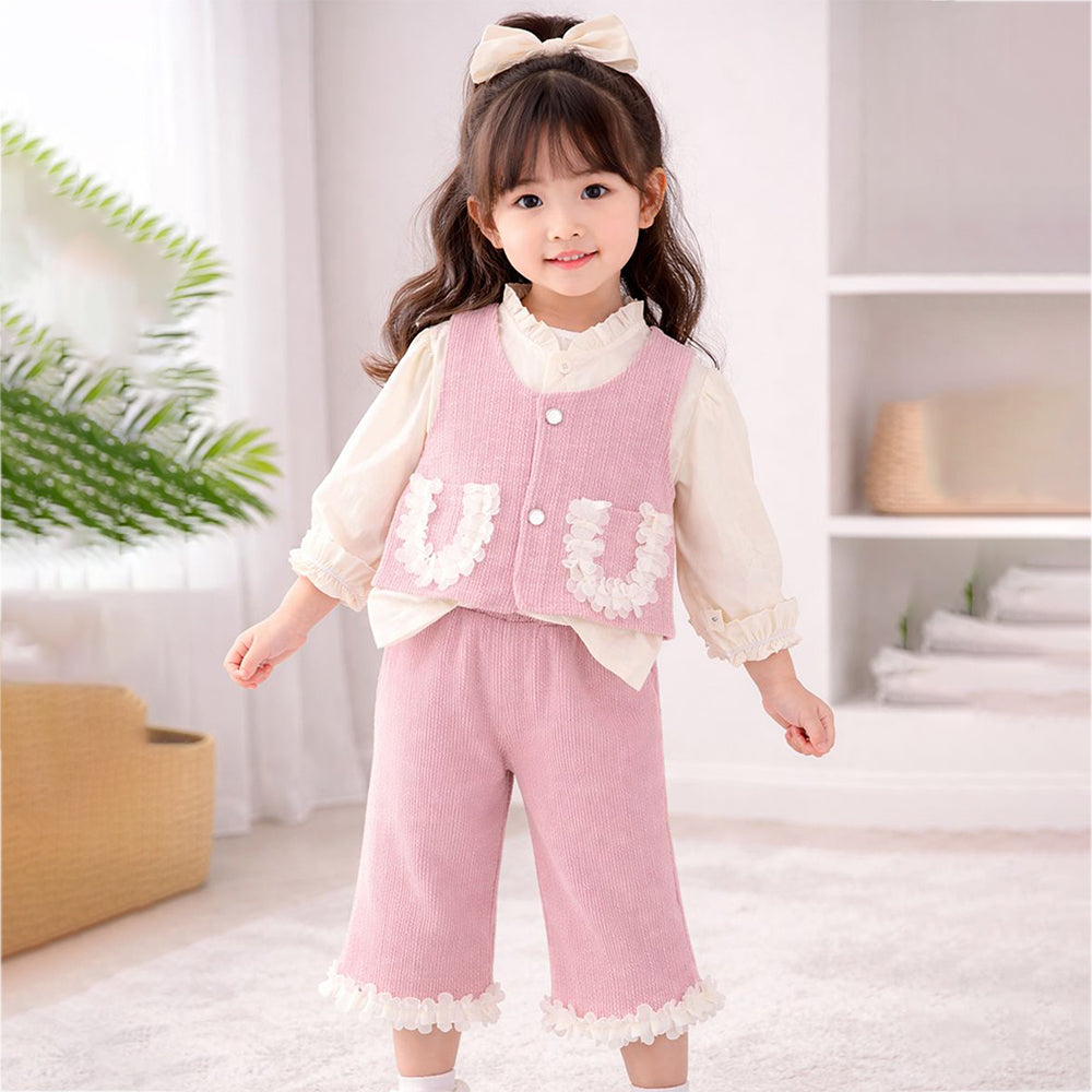 3 Pcs Set Pink Frill Pocket Vest,Shirt & Matching Pants for Girls