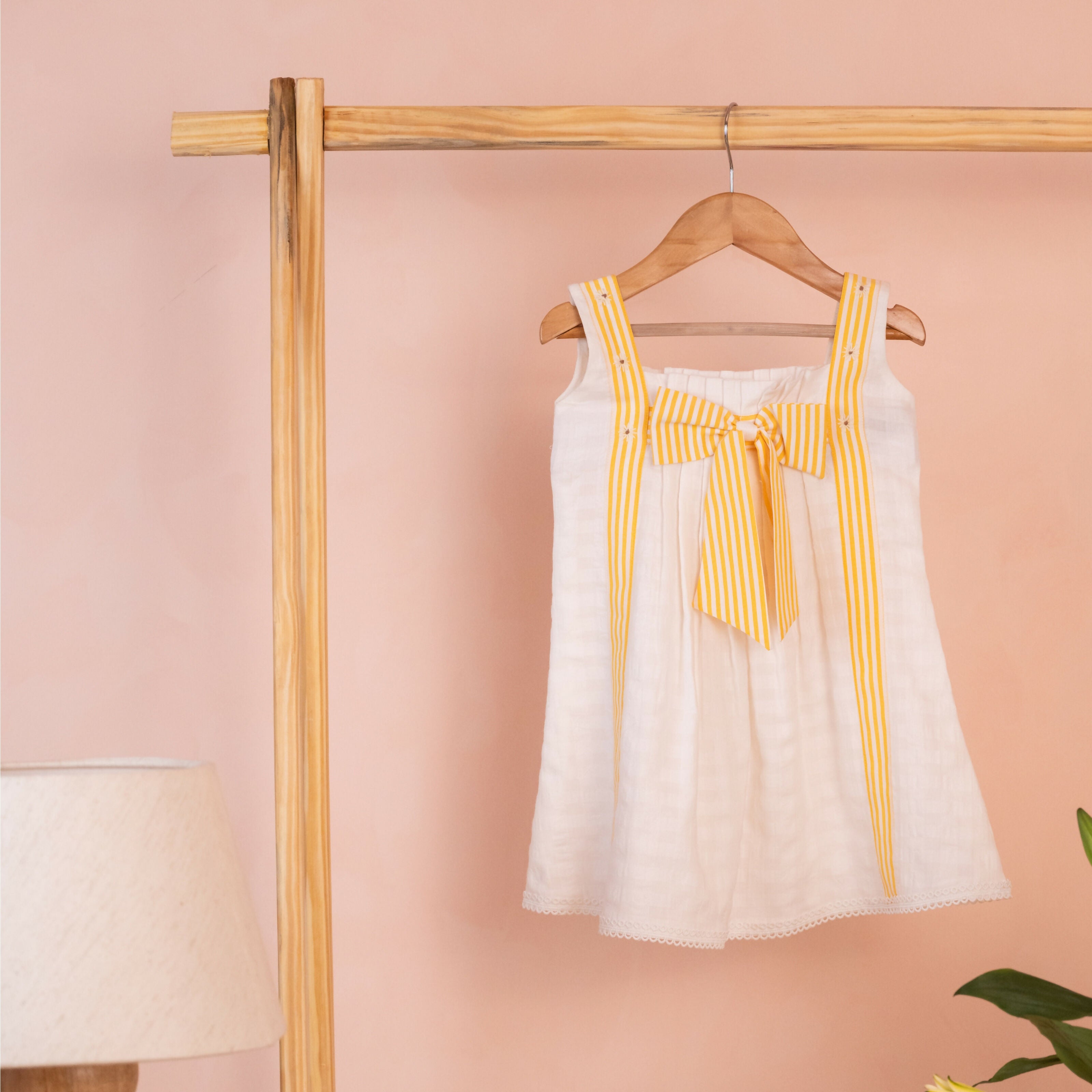 This charming white sleeveless dress for girls features delicate lace detailing at the hem and cheerful yellow striped ribbon accents, topped with a playful bow. Lightweight and breezy, it’s perfect for sunny days and casual outings. This is a made-to-order product. It will take approximately 10 to 12 days to manufacture, and an additional 7 to 10 business days for delivery.