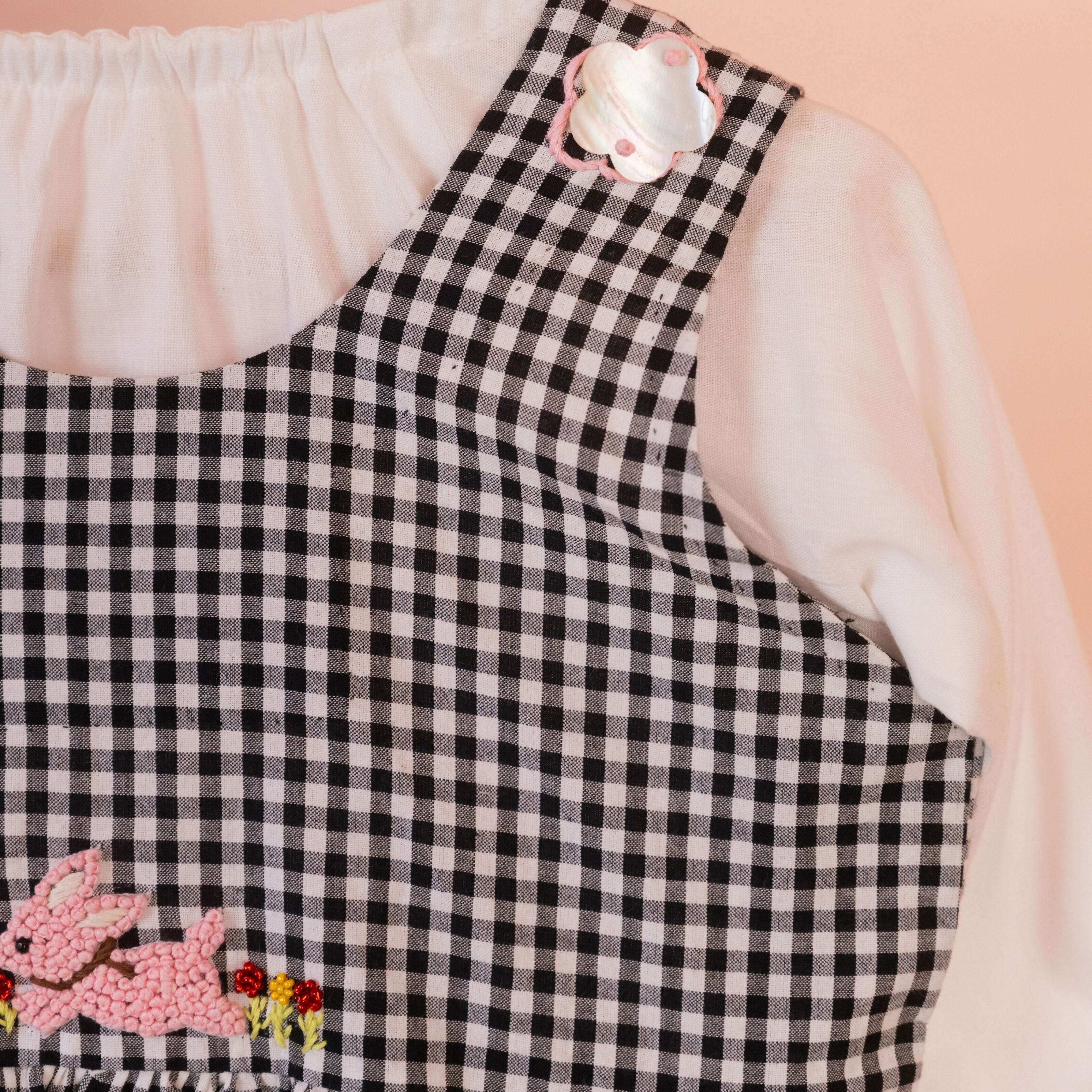 This charming black-and-white gingham dress with white inner shirt features delicate hand embroidery of pink bunnies and floral motifs, adding a whimsical touch. The sleeveless design and gathered waist make it a comfortable and playful pick for everyday adventures. This is a made-to-order product. It will take approximately 10 to 12 days to manufacture, and an additional 7 to 10 business days for delivery.