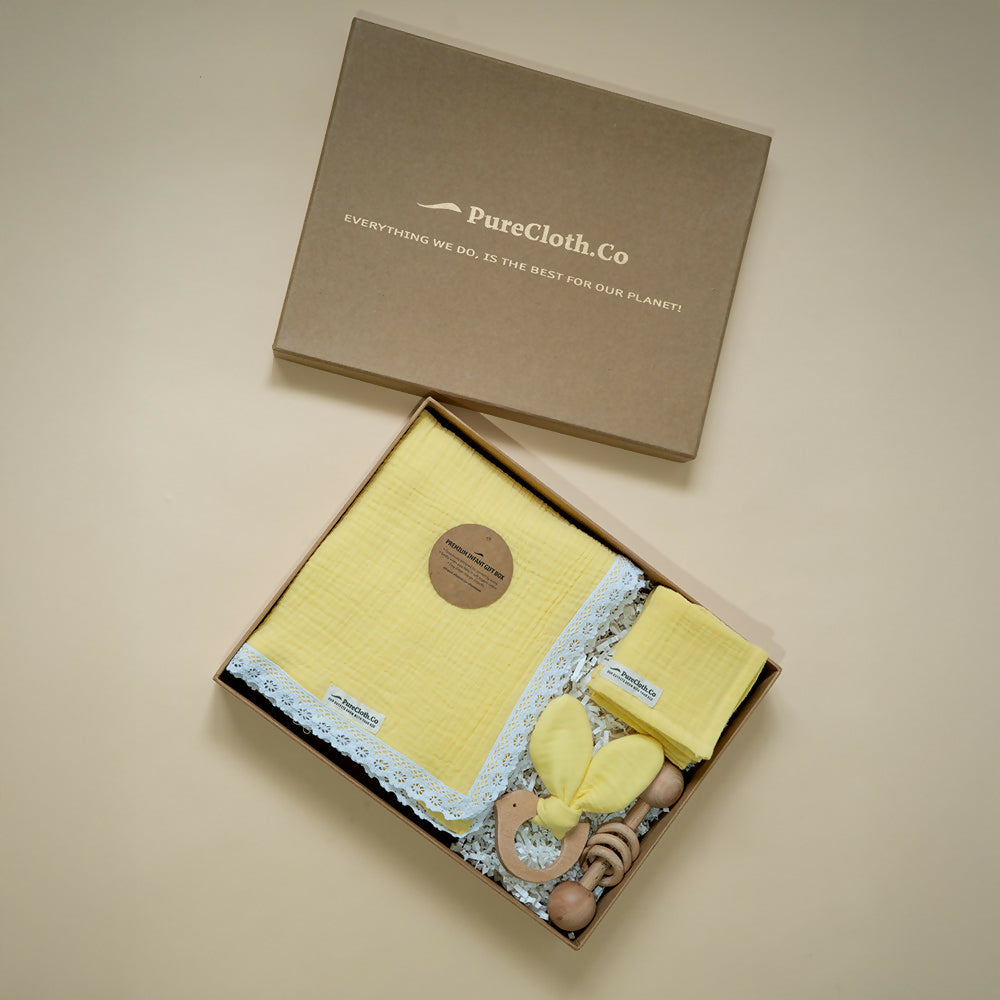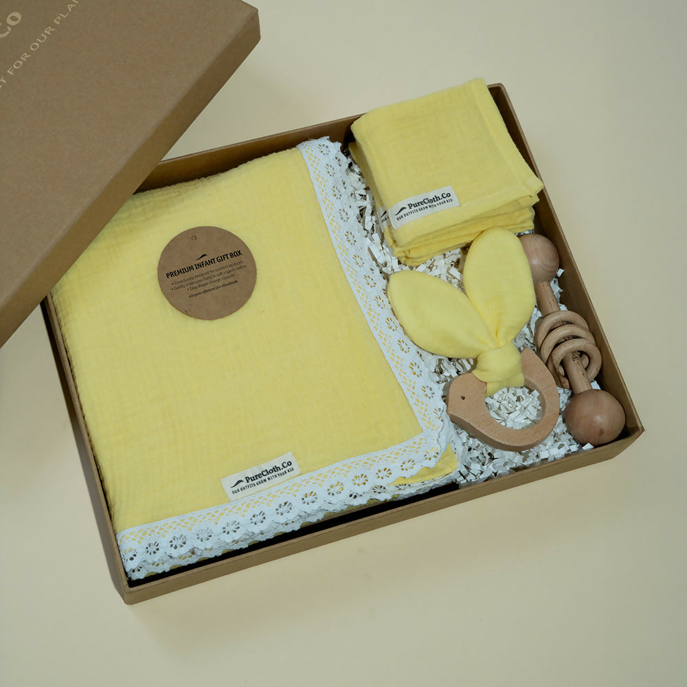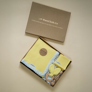 Introducing 'Mellow Yellow Baby Wrap" Organic Baby Muslin Swaddle perfect to wrap your little one in comfort and style. It features a delicate lace trim, in soft Yellow shade.