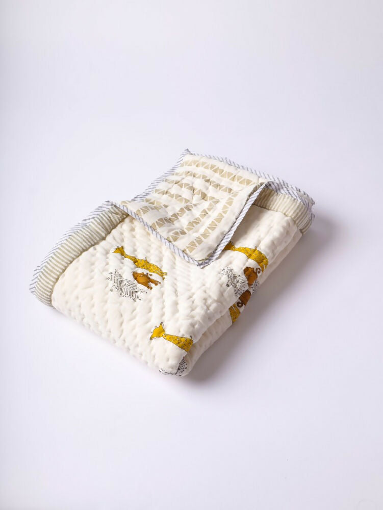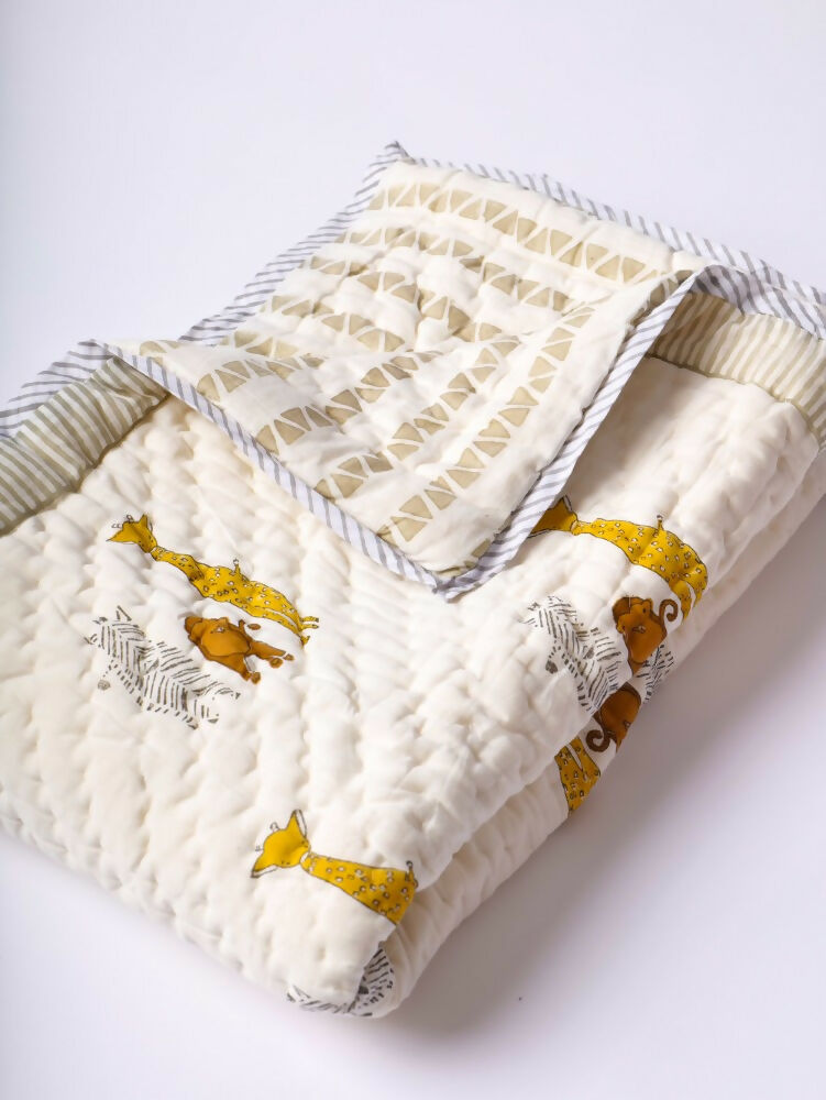 Snuggle up and stay cozy, in our handcrafted quilt. Block printed cotton muslin, hand quilted with cotton lining. Made with 100% cotton. Breathable soft and cozy.