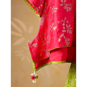 A charming two-piece outfit featuring a hot pink short kurti-style top paired with olive green sharara pants. The top is crafted in a soft, lustrous fabric with delicate white floral motifs, highlighted by lime green piping along the neckline, sleeves, and hem. The asymmetrical hemline is finished with playful fabric tassels, adding a handcrafted touch.