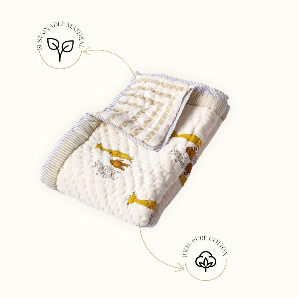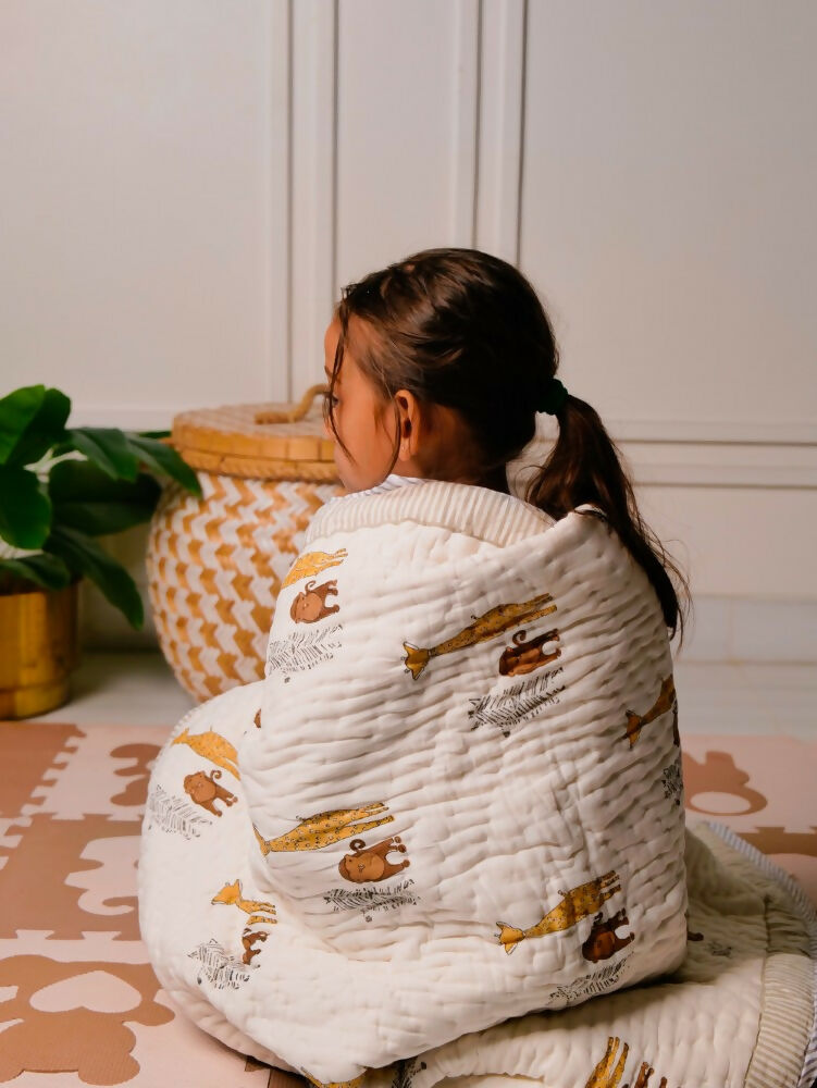 A perfect set for your little Infant. Our signature Infant Quilt with perfect companions of two Bolsters and a Pillow. The pillow and bolsters come with 100% cotton. Block printed cotton muslin, hand quilted with cotton lining. Made with 100% cotton. Breathable soft and cozy.