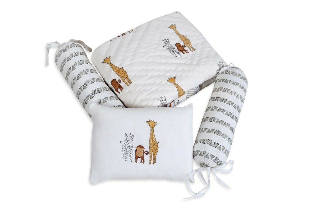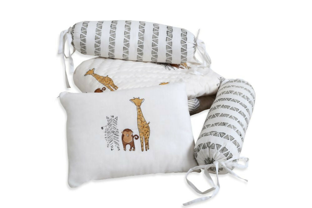 A perfect set for your little Infant. Our signature Infant Quilt with perfect companions of two Bolsters and a Pillow. The pillow and bolsters come with 100% cotton. Block printed cotton muslin, hand quilted with cotton lining. Made with 100% cotton. Breathable soft and cozy. Comes with a Rai pillow.