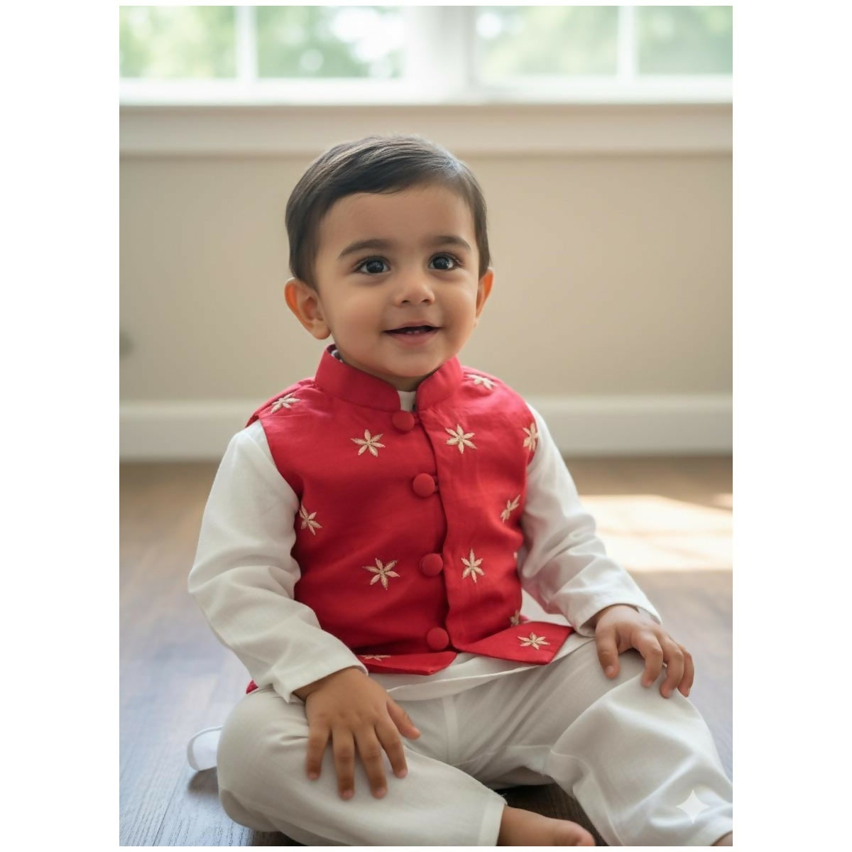 A royal treat for the tiniest nawabs - this carrot red muslin jacket set is hand embroidered with delicate bootis and finished with golden aari work. Paired with an ultra comfortable muslin kurta pyajama, its designed to keep your little one comfortable while looking effortlessly regal.