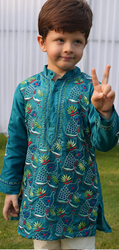 A tunning peacock jaal kurta adorned with intricate hand chikankari embroidery in vibrant multicolour threads. Made with pure silk, this teal blue kurta is a real head turner and heirloom piece for your little one. Our kurtas come with pockets, matching pyajamas and soft, pure fabrics for ultimate comfort.