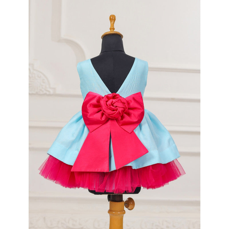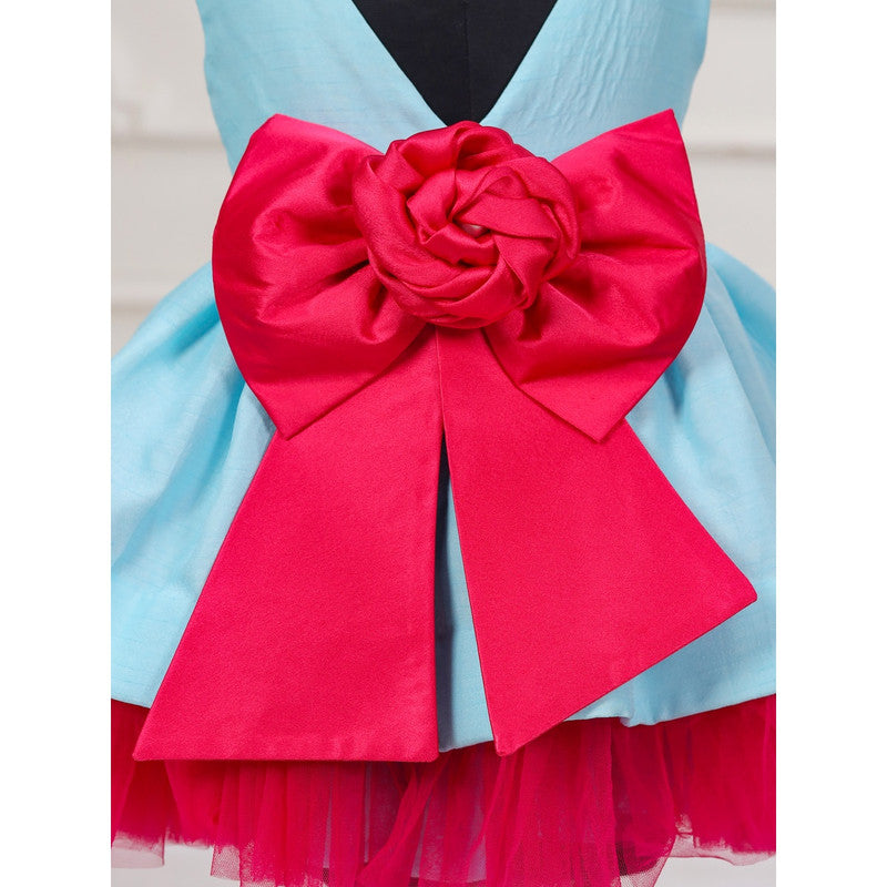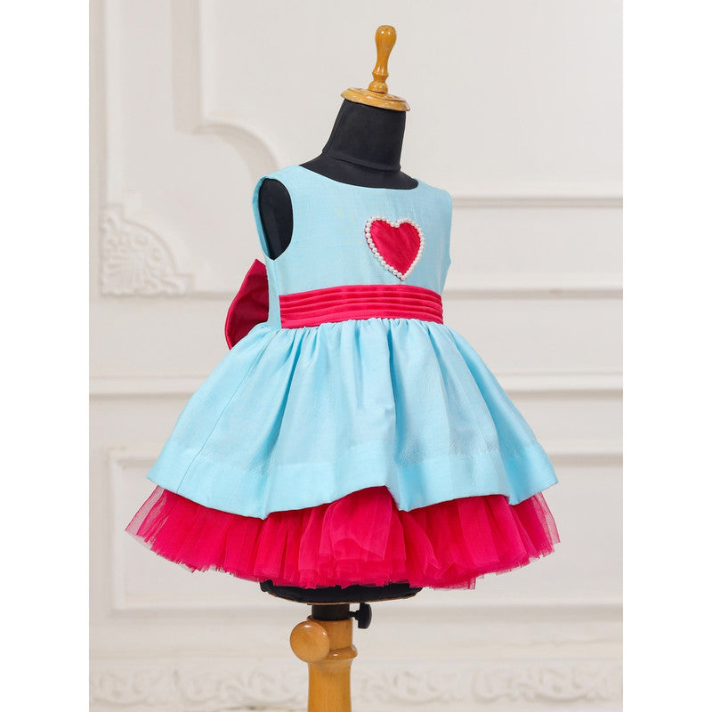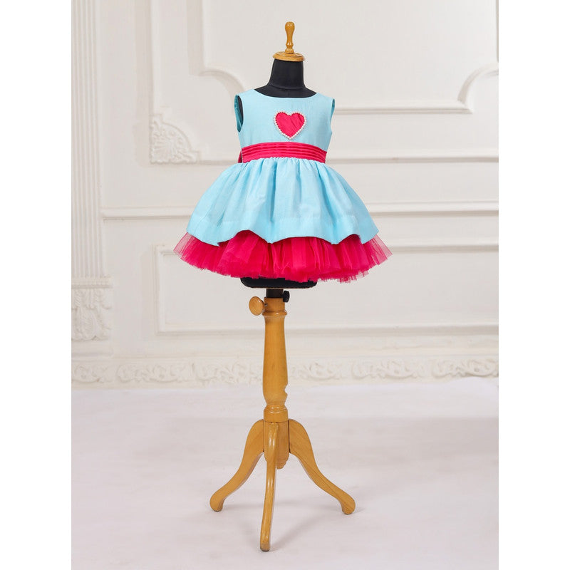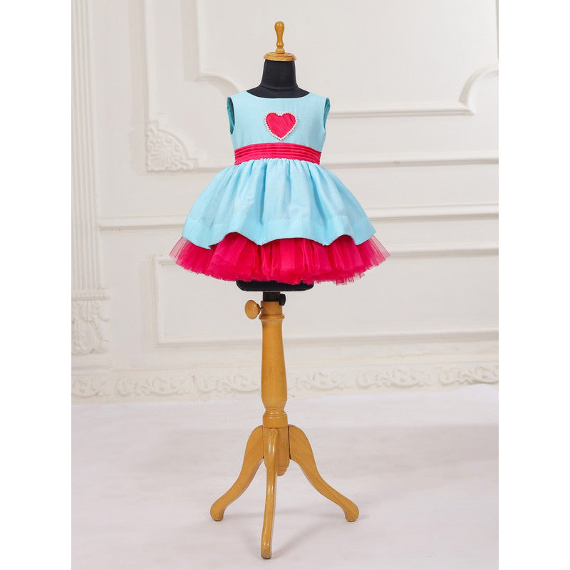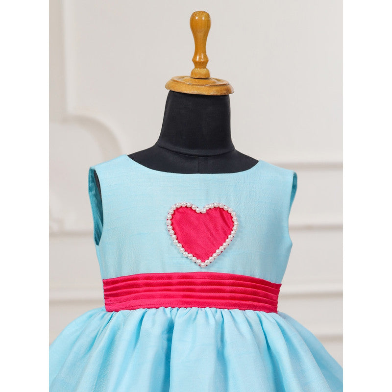 A sleeveless frock designed in a charming aqua blue and hot pink color combination. The bodice is aqua blue and features a cute heart motif appliqué at the center, adding a sweet, youthful touch. A pink waistband neatly defines the empire waist, enhancing the silhouette.