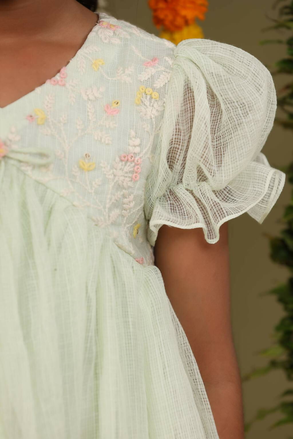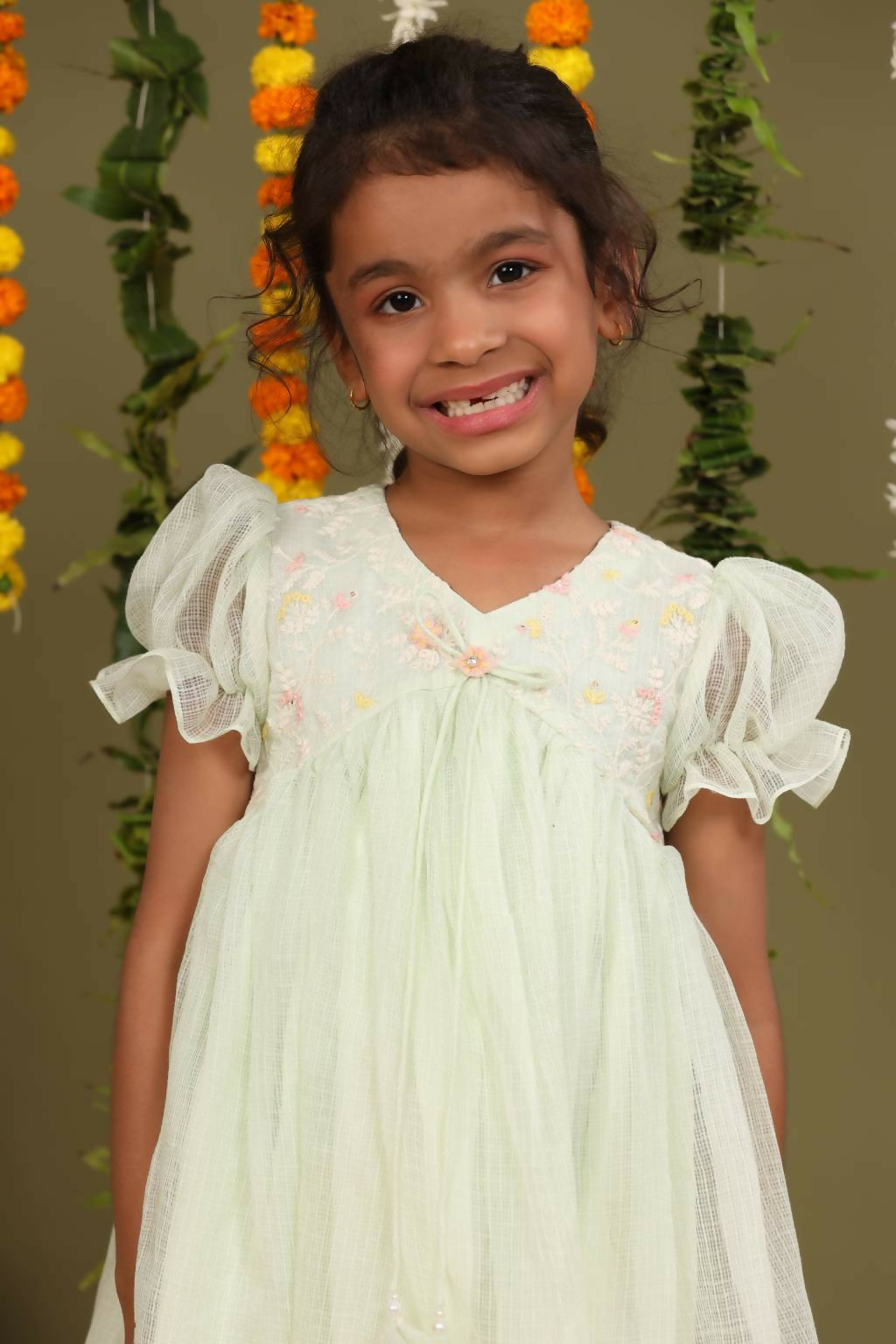 This is a comfortable festive wear for upcoming festive season . Outfit with elegant embroidery on top and laces used to enhance the overall look. Elbow puff sleeves