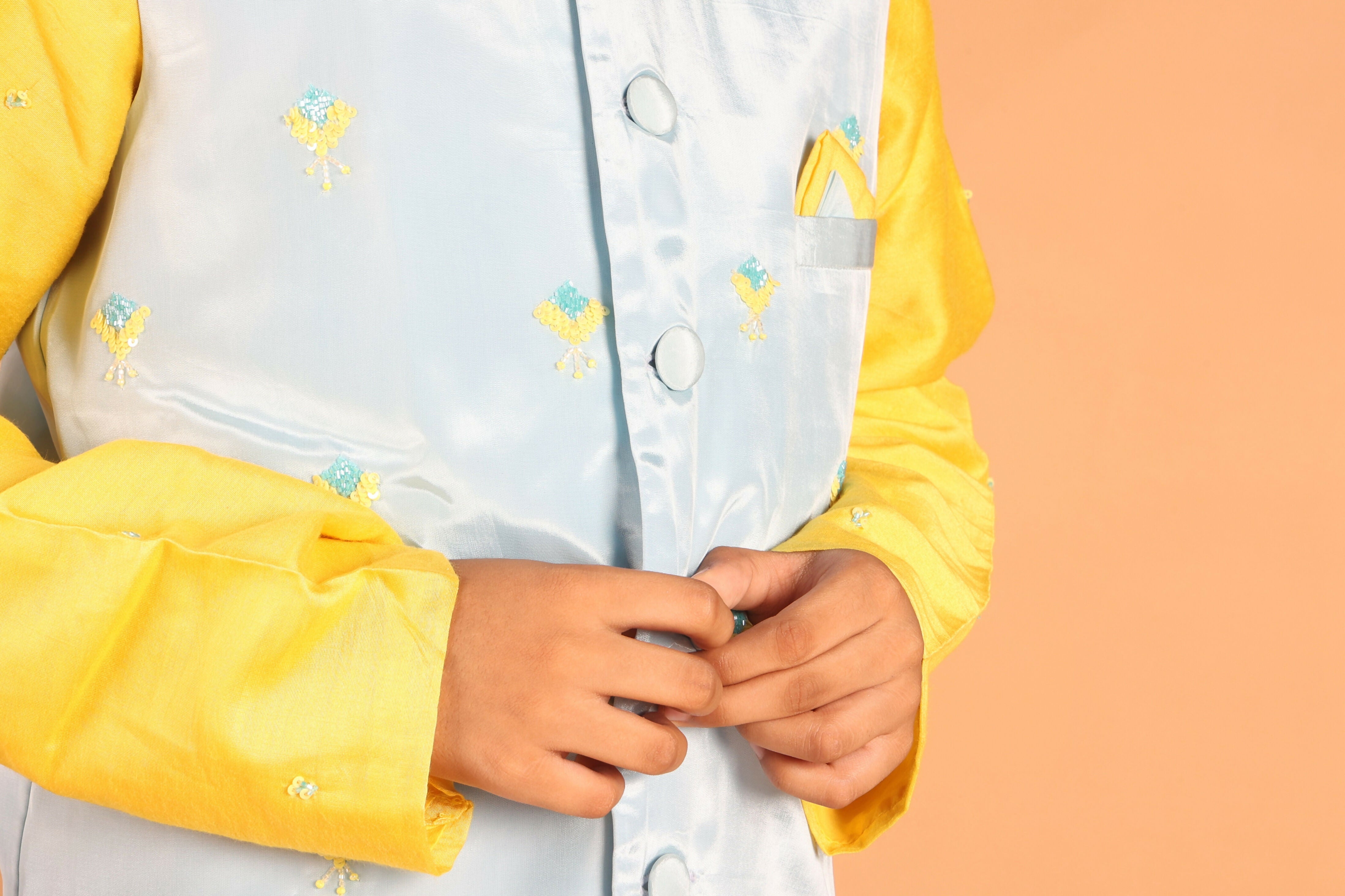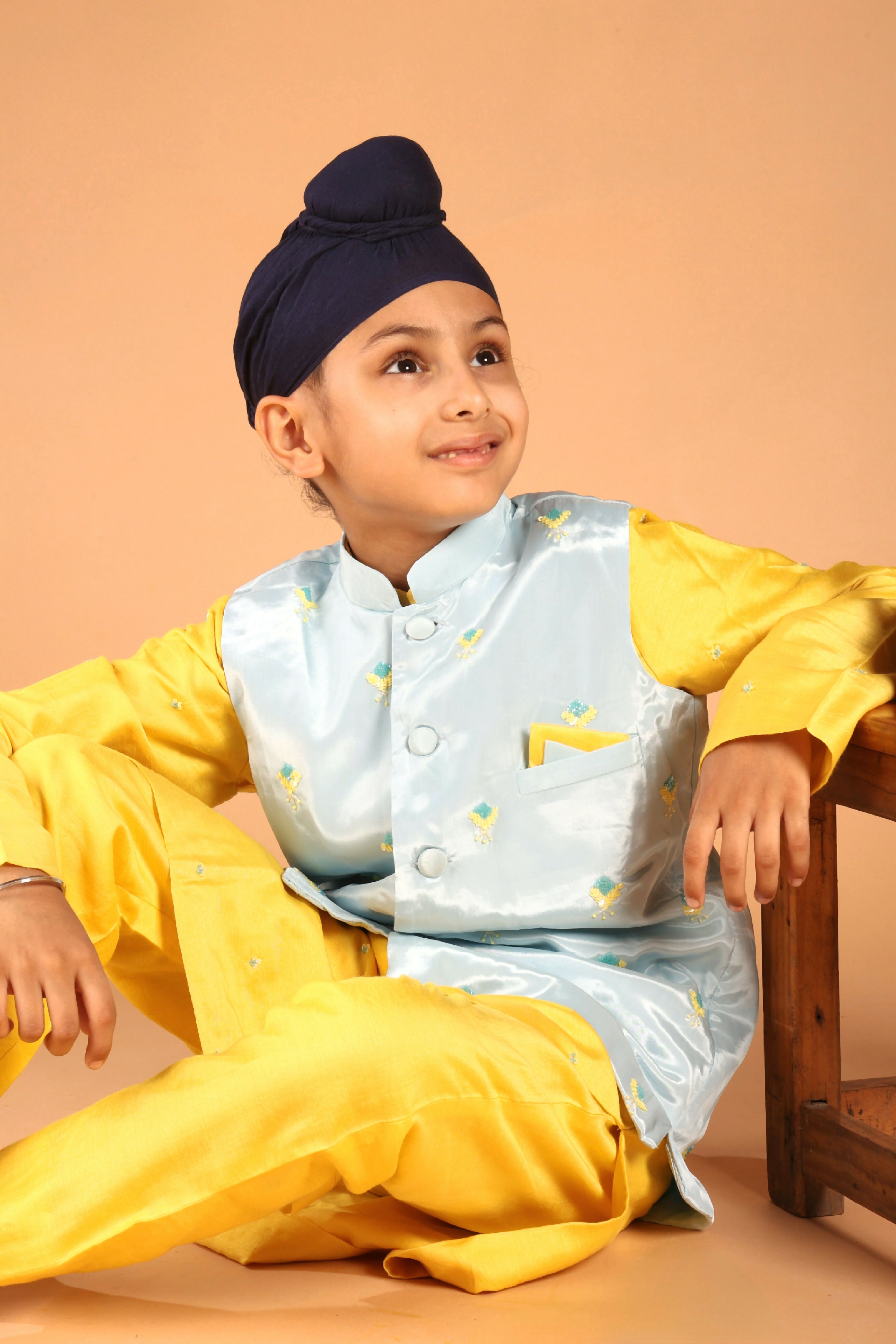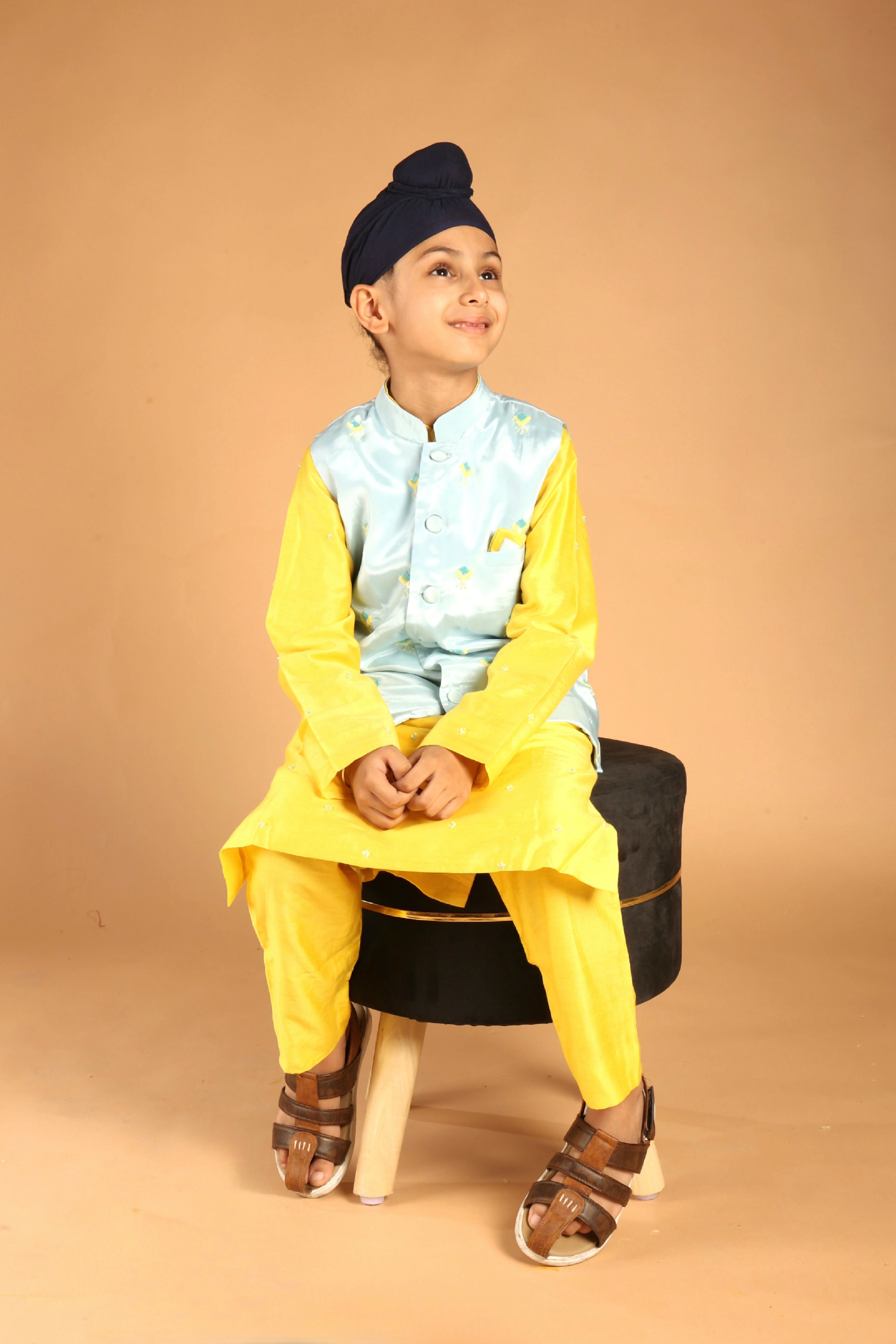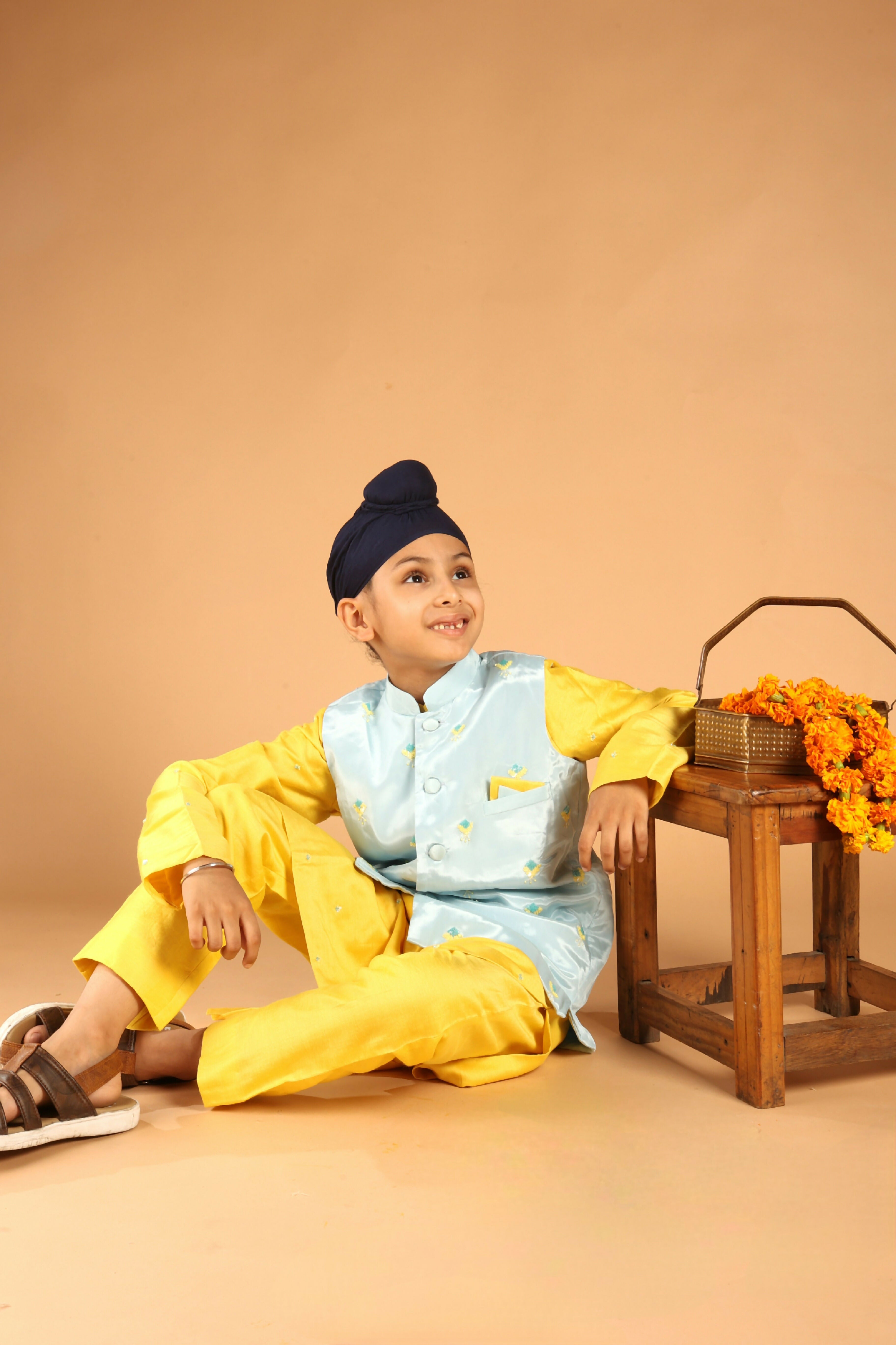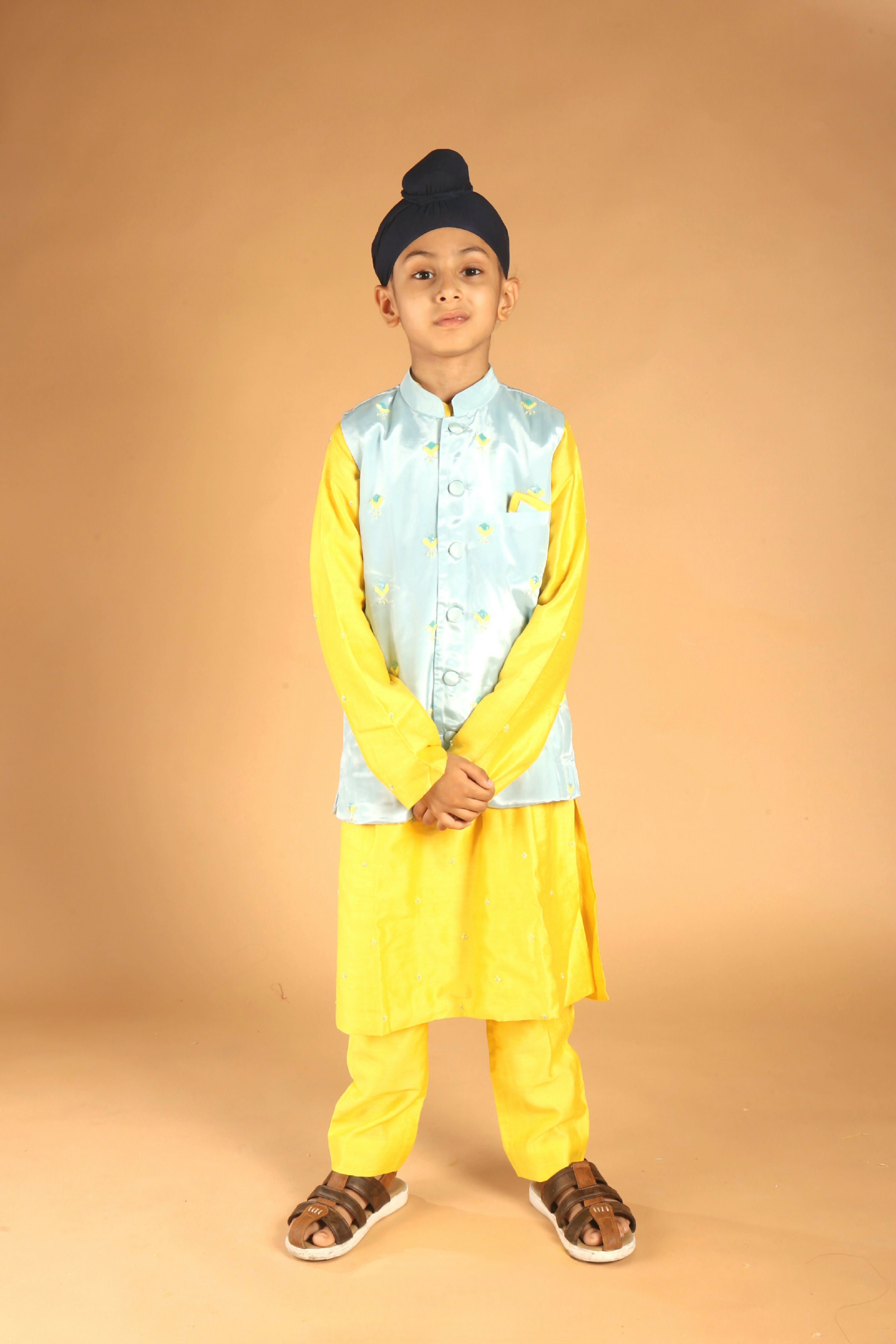 Let your little one bloom in festive hues with our Phoolwar Kurta Set — featuring a soft blue embroidered Nehru jacket paired with a sunshine yellow kurta-pajama. Perfect for joyful celebrations and timeless family moments. This is a made-to-order product. It will take approximately 10 to 12 days to manufacture, and an additional 7 to 10 business days for delivery. No returns or exchanges are accepted on made-to-order products.