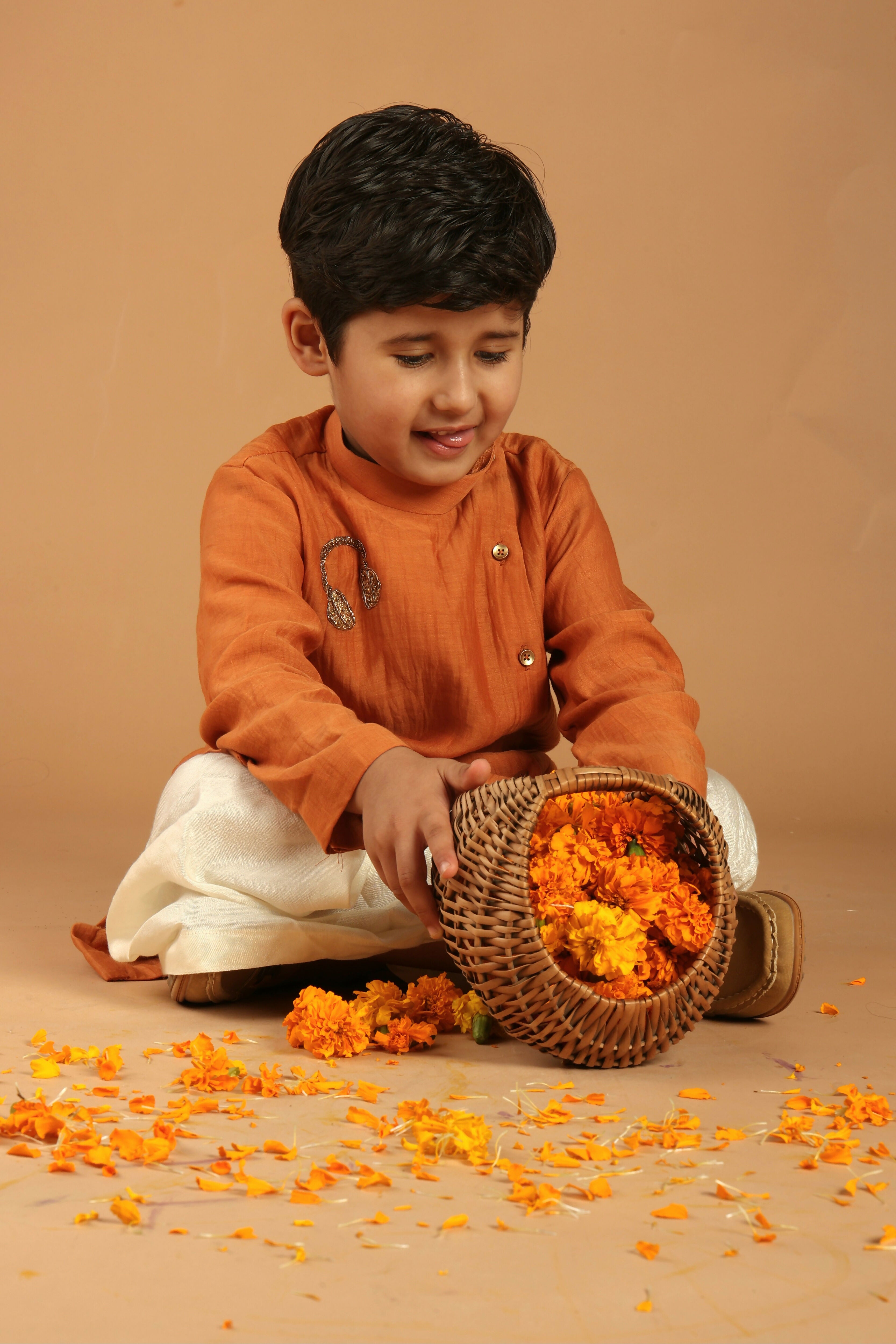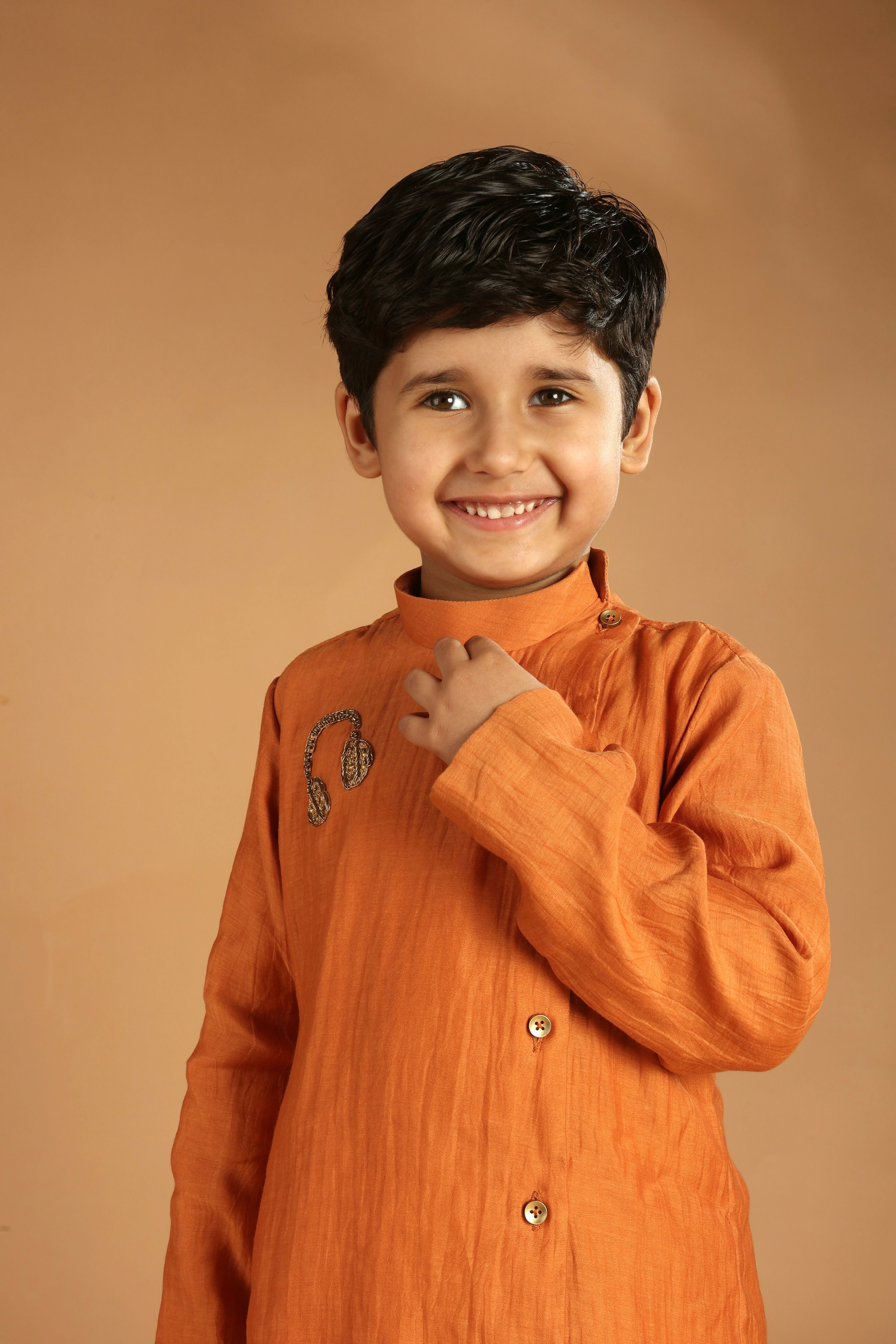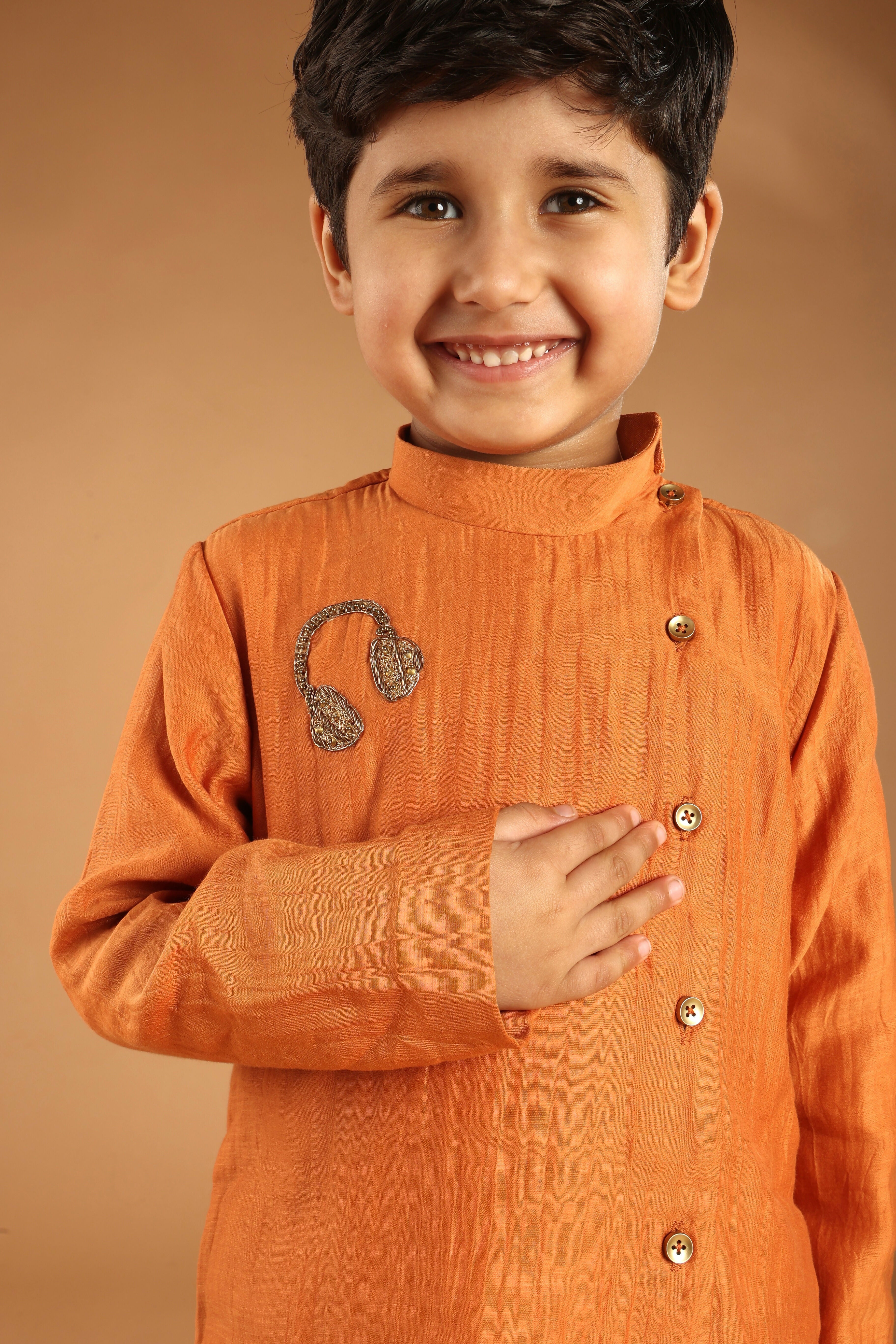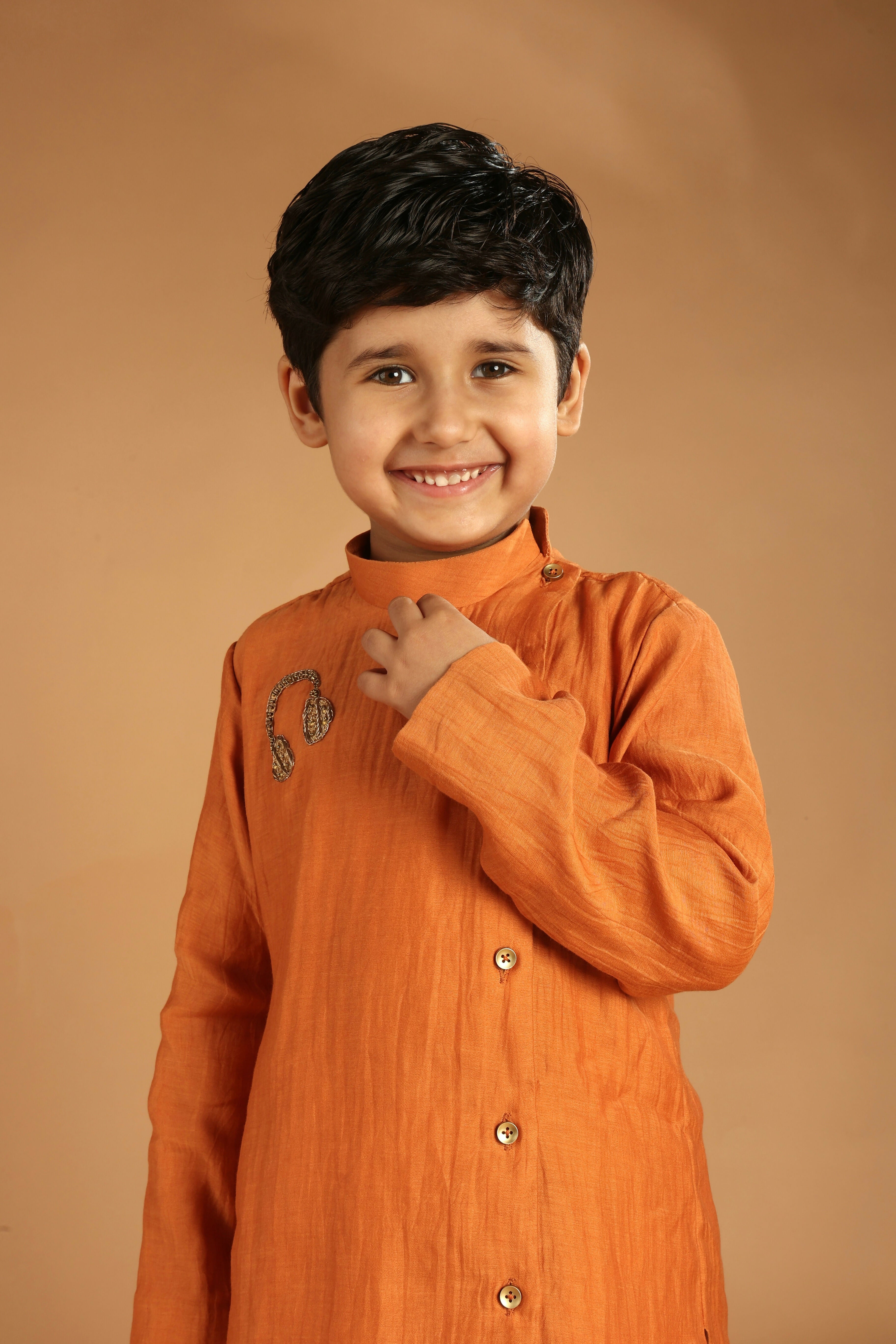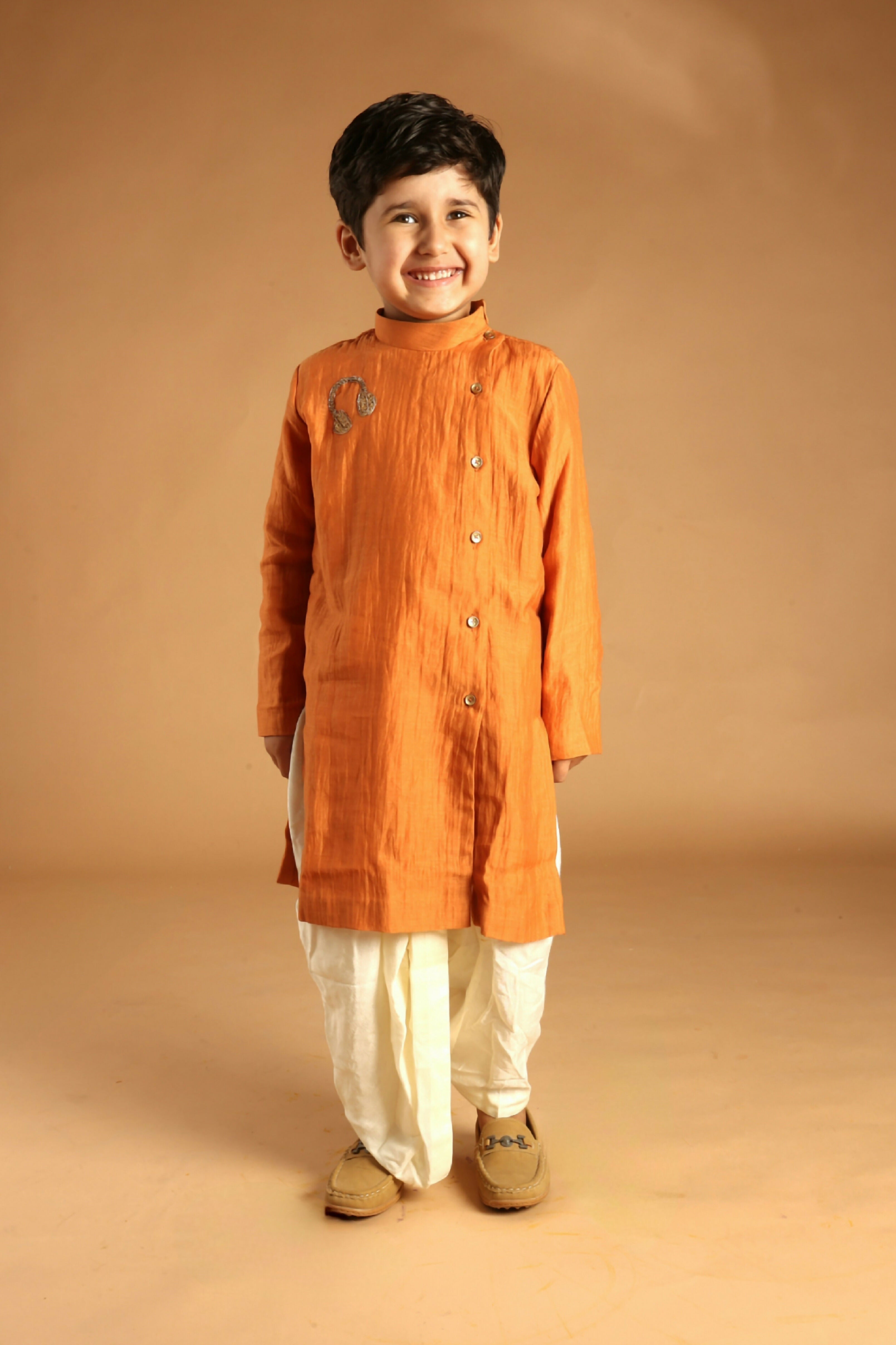 A classic in radiant saffron, the Kesariya Noor Kurta Set brings effortless grace to festive dressing. Designed with an asymmetrical button placket, subtle shoulder embroidery, and paired with soft white salwar, this outfit is as joyful as your little one’s smile-perfect for weddings, pujas, or family celebrations. This is a made-to-order product. It will take approximately 10 to 12 days to manufacture, and an additional 7 to 10 business days for delivery. No returns or exchanges are accepted on made-to-order products.