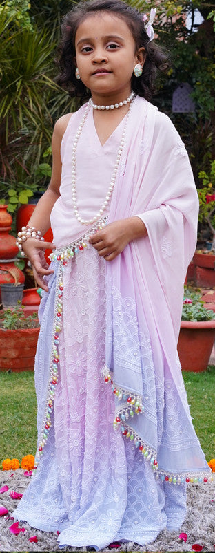 A dreamy pure gorgette lehenga that melts from pink to purple in soft ombre shades. Hand embroidered in fine white chikankari and embellished with delicate pearl work, this piece beautifully blends colour, craft and charm - making it a showstopper for every celebration.