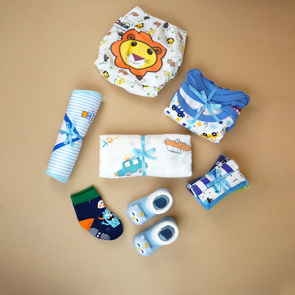 1. 22 Pcs Assorted Gift Hamper Set: This stunning 22 pcs Gift Hamper set is a beautiful assortment of exclusive essentials for a baby girl/baby boy. This hamper includes • 1 extra spacious Home shaped Pouch/Storage Bag • 2 Beautifully printed onesie •1 Cloth Diaper •1 pair of Socks • 1 Swaddle • 8 Napkins • 2 Bibs • 1 pair of 3d booties • 1 Toy • 1 matching Bamboo Fibre Lunchbox and Cup.
