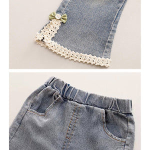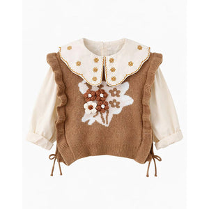 1. Pretty Floral Knit Design: This elegant girls set features a soft brown knitted cardigan with delicate ruffle detailing on the sleeves and floral knit pattern on the front with full-sleeve inner T-shirt with a classic scalloped collar. The cardigan is open at the sides with adjustable tie-up, adding a unique and stylish touch, paired with classic blue denim pants finished with lace trim and cute bow accents near the hem, creating a graceful look.