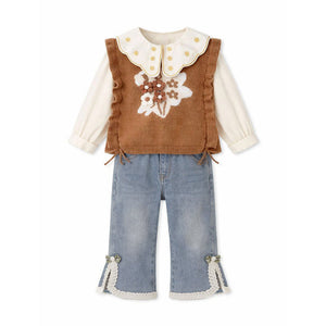LSB 3 Pcs Set,Brown Peter Pan Collared Floral Knitted Cardigan,T-shirt,& Denims Partywear for Girls