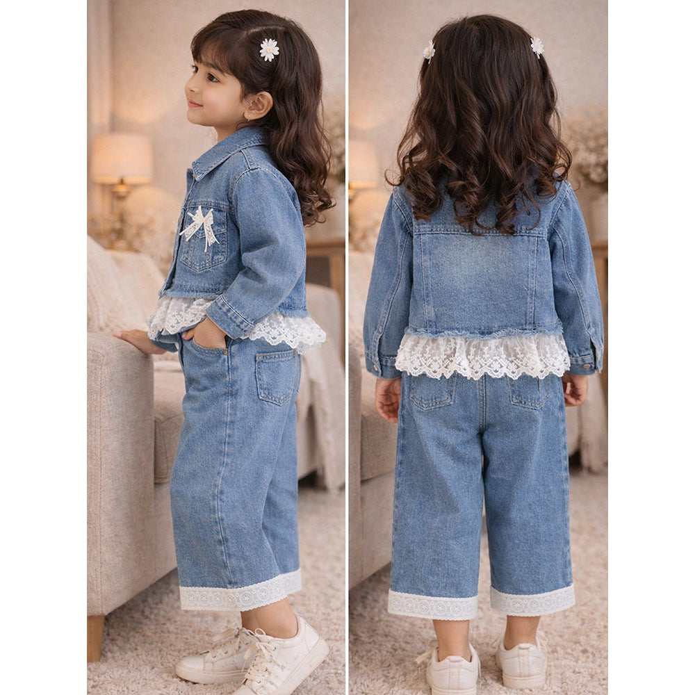 1. 2 Pcs Set: This stylish set includes a denim jacket accented with white lace frills at the hem and a cute lace bow on the front for a charming touch, paired with matching denim pants with lace-trimmed hems that complete the coordinated look.