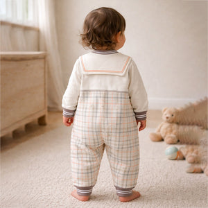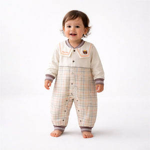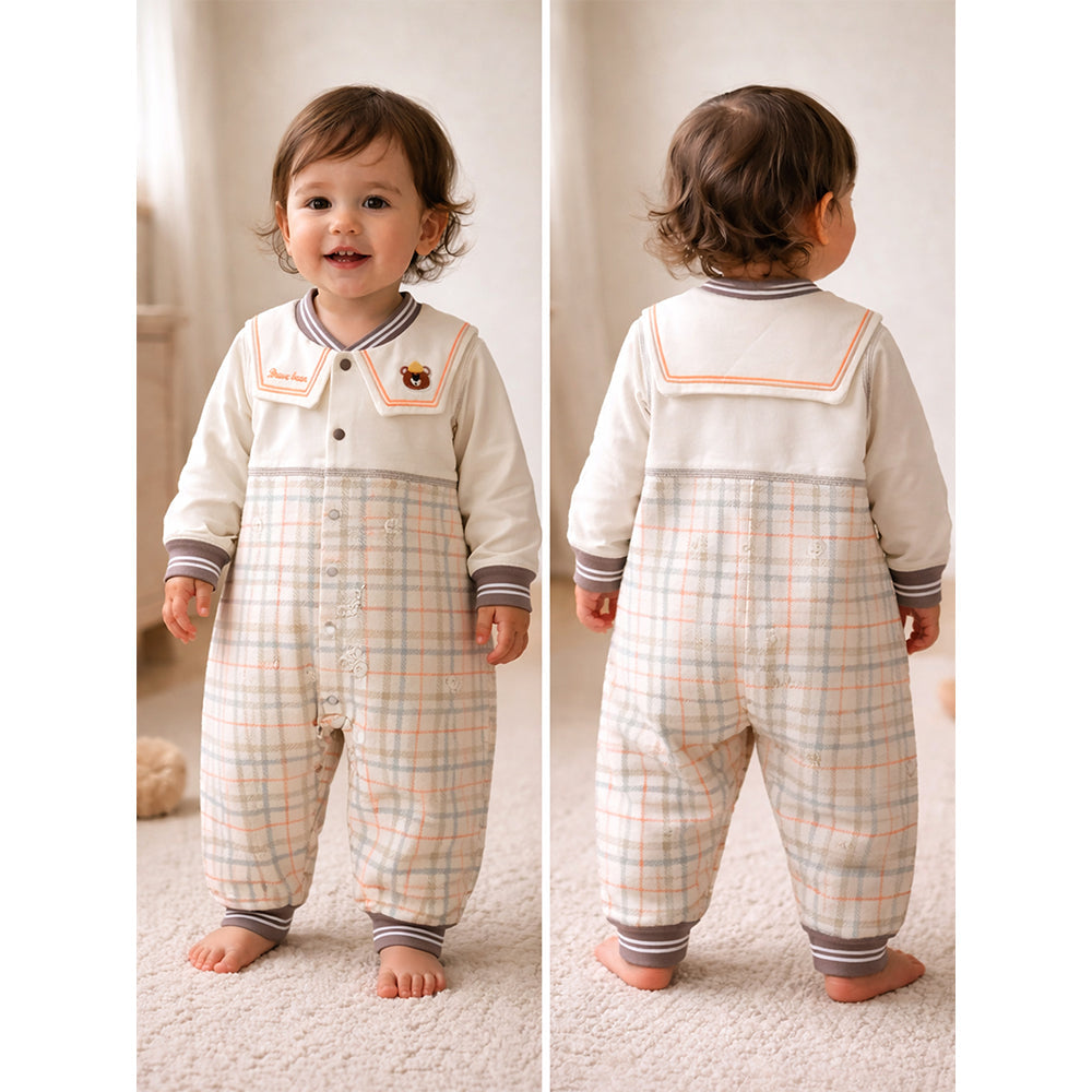 1. Adorable Sailor Collar Design: Give your little one a charming and classic look with this romper featuring a cute sailor-style collar with contrast stripes. The “Brave Bear” text and the embroidered bear with a tiny cap add extra sweetness to the outfit. The pastel checks pattern with teddy on the lower half adds a fresh, stylish touch—perfect for everyday outings and cosy indoor play.
