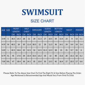 2. Specialised Swimsuit Design: This two-piece swim suit comes in a royal blue color with contrast red side panels. This Swimsuit is perfect for water sports activities like Scuba Dives and Fun Water Sport adventure. A must have for all the wild adventures. The sleeves feature marine-themed graphics, giving it a bold and sporty look.