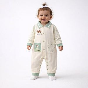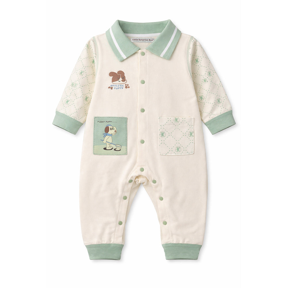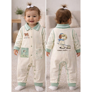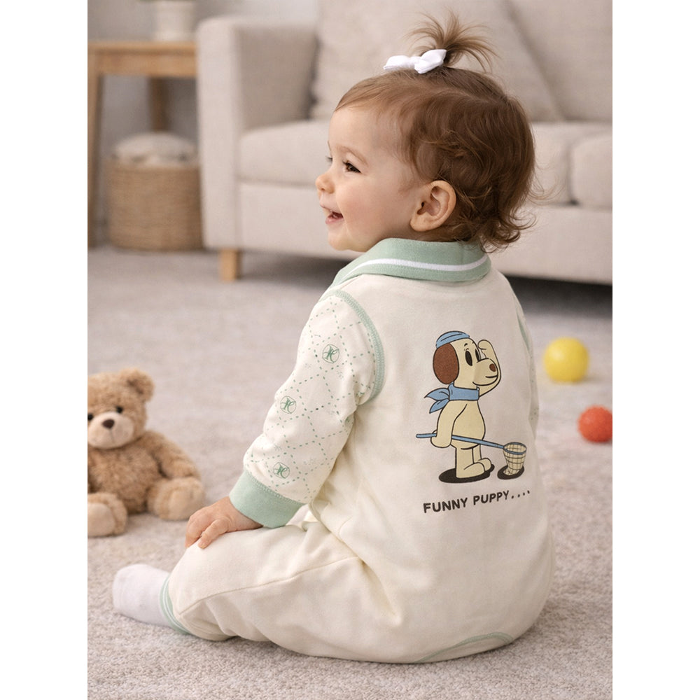 1. Adorable Puppy-Themed Design: Dress your little one in this cute and playful romper featuring a sweet puppy graphic along with a matching puppy patch and pocket, adding extra charm to the outfit. The soft pastel green and cream colour combination gives it a calm, fresh, and adorable everyday look.