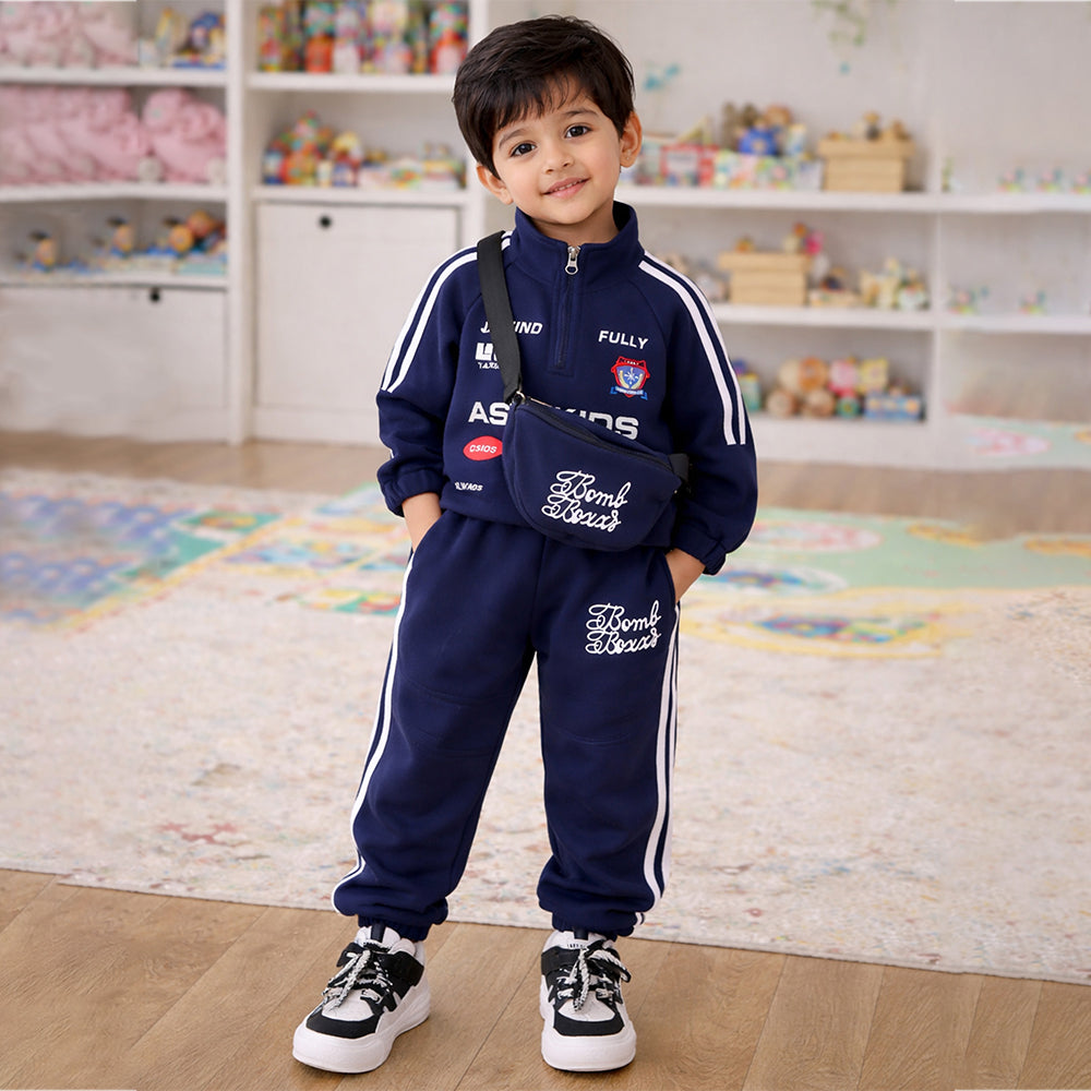 Sporty Navy Tracksuit Set with Matching Sling Bag for Kids
