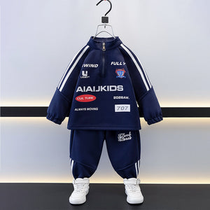 1. Sporty Design: This sporty kids tracksuit set features a navy blue sweatshirt with racing inspired prints, contrast white stripe detailing on the sleeves, and a stylish zip at the neck. It comes paired with matching navy pants along with a matching sling bag, giving it a trendy cool look.