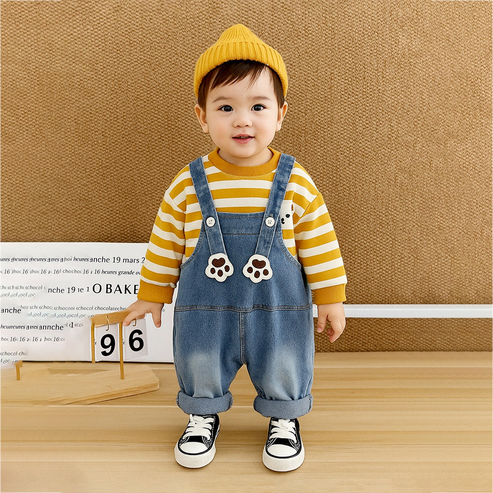 Brown stripes tee with Khakhi Bear Dungaree, 2 Pcs Clothing Set For Toddlers And Kids