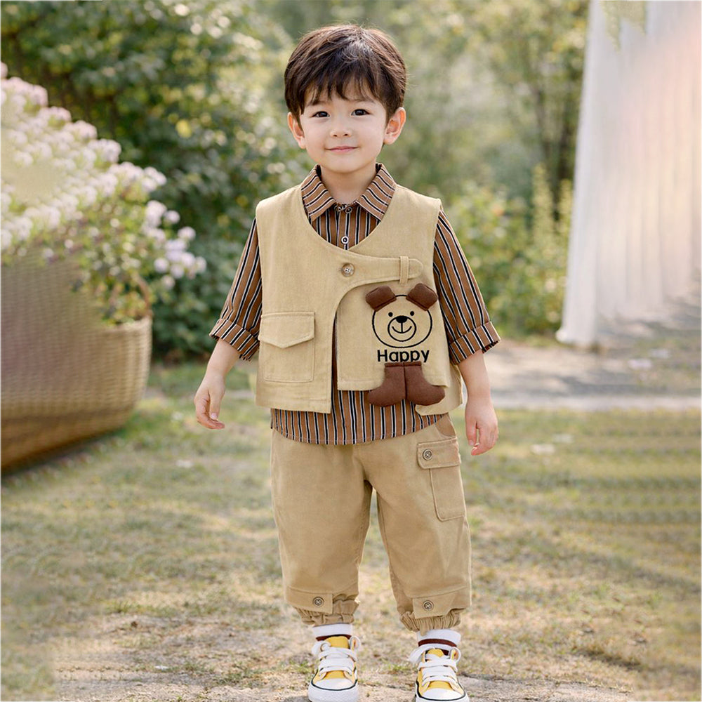 3 Pcs,Brown Happy Ted Vest,Brown Stripes Shirt,Pants set for Kids