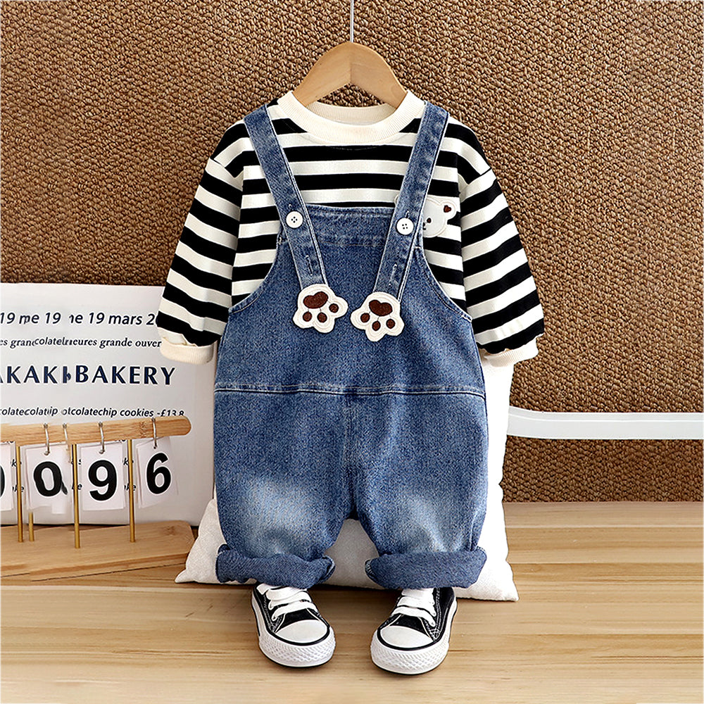 Black Mad Ted Dungaree with Stripes T-shirt, 2 Pcs Clothing Set For Toddlers And Kids