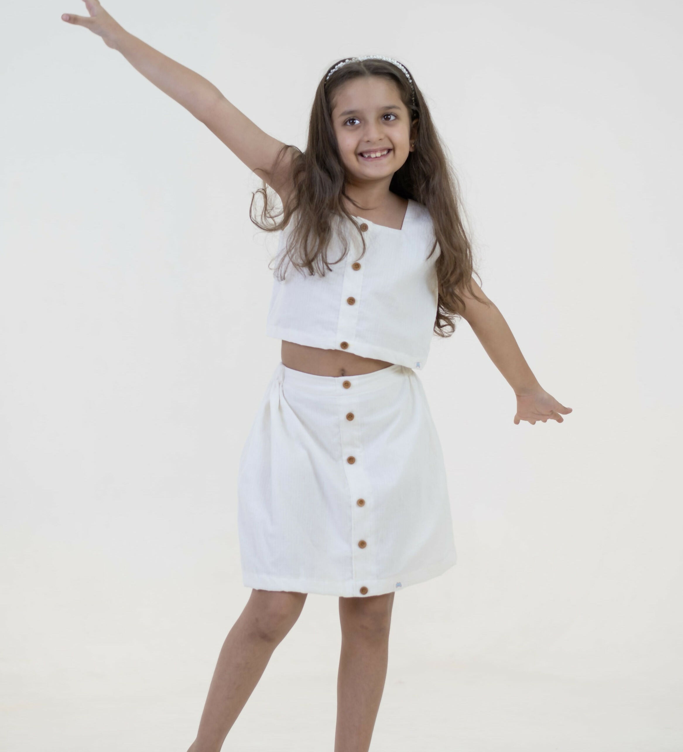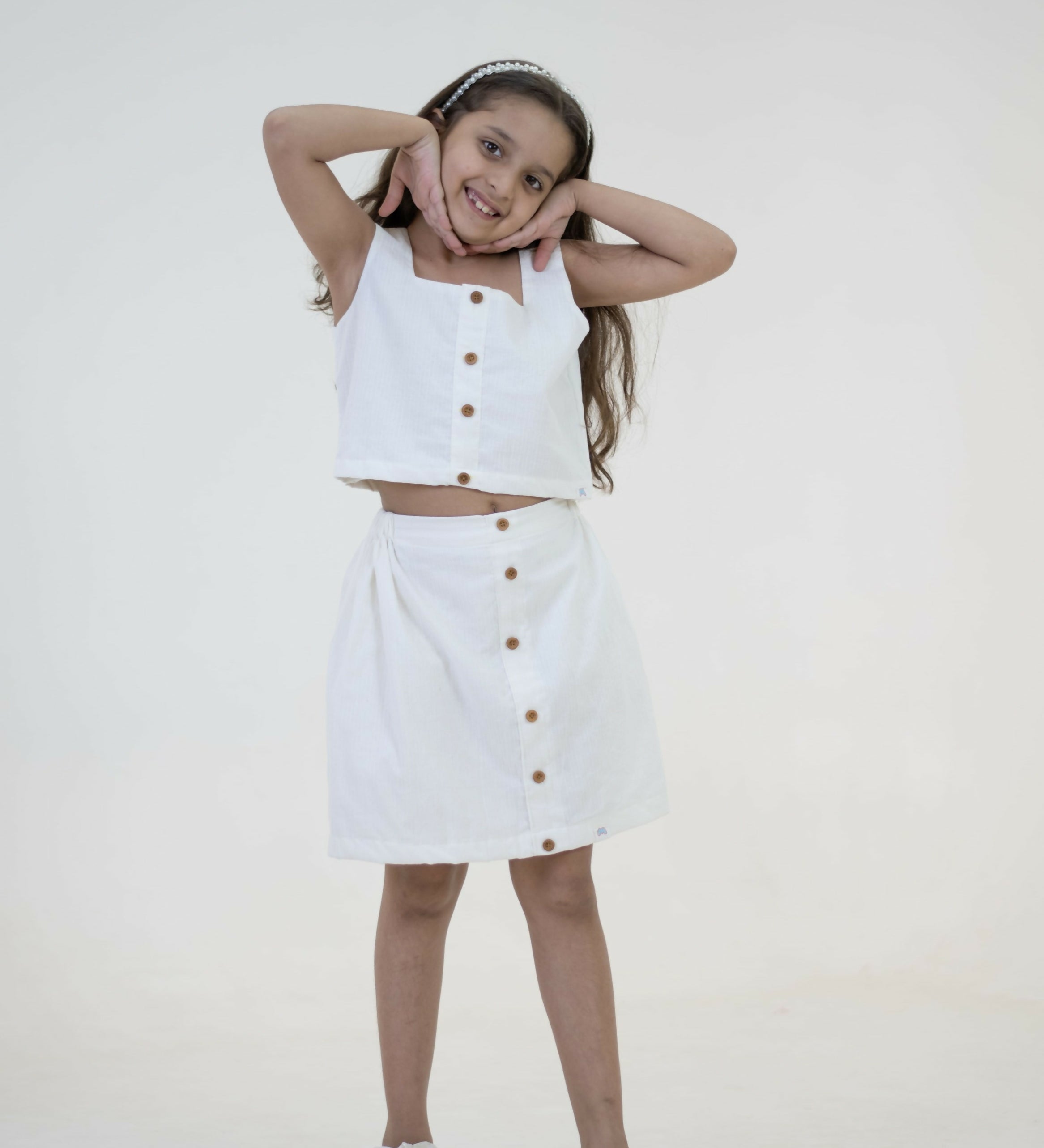 Mamarill Girls Classy Co-Ord Set In Crisp White, Elevated By Stylish Wooden Buttons On The Sleeveless Top.
