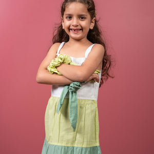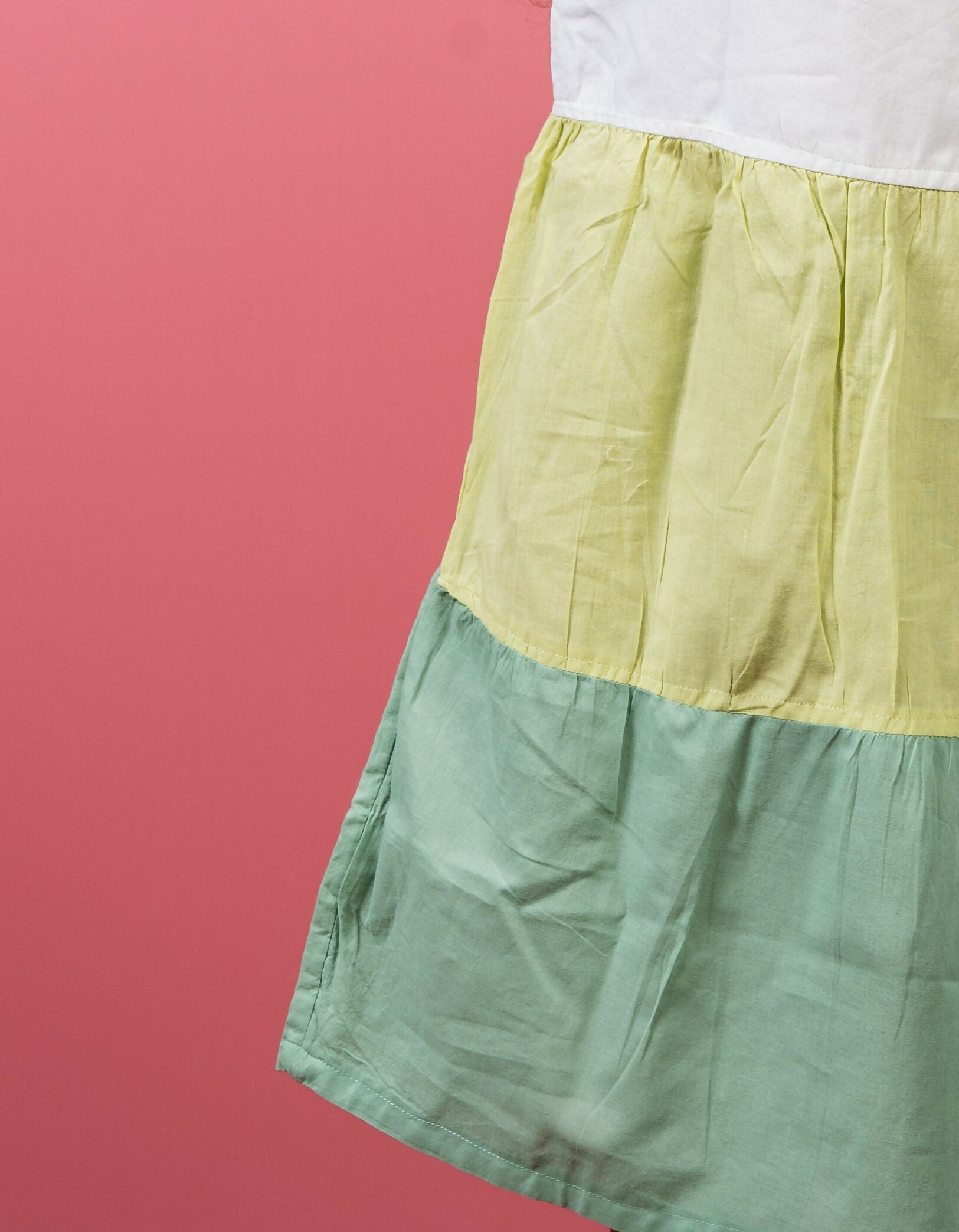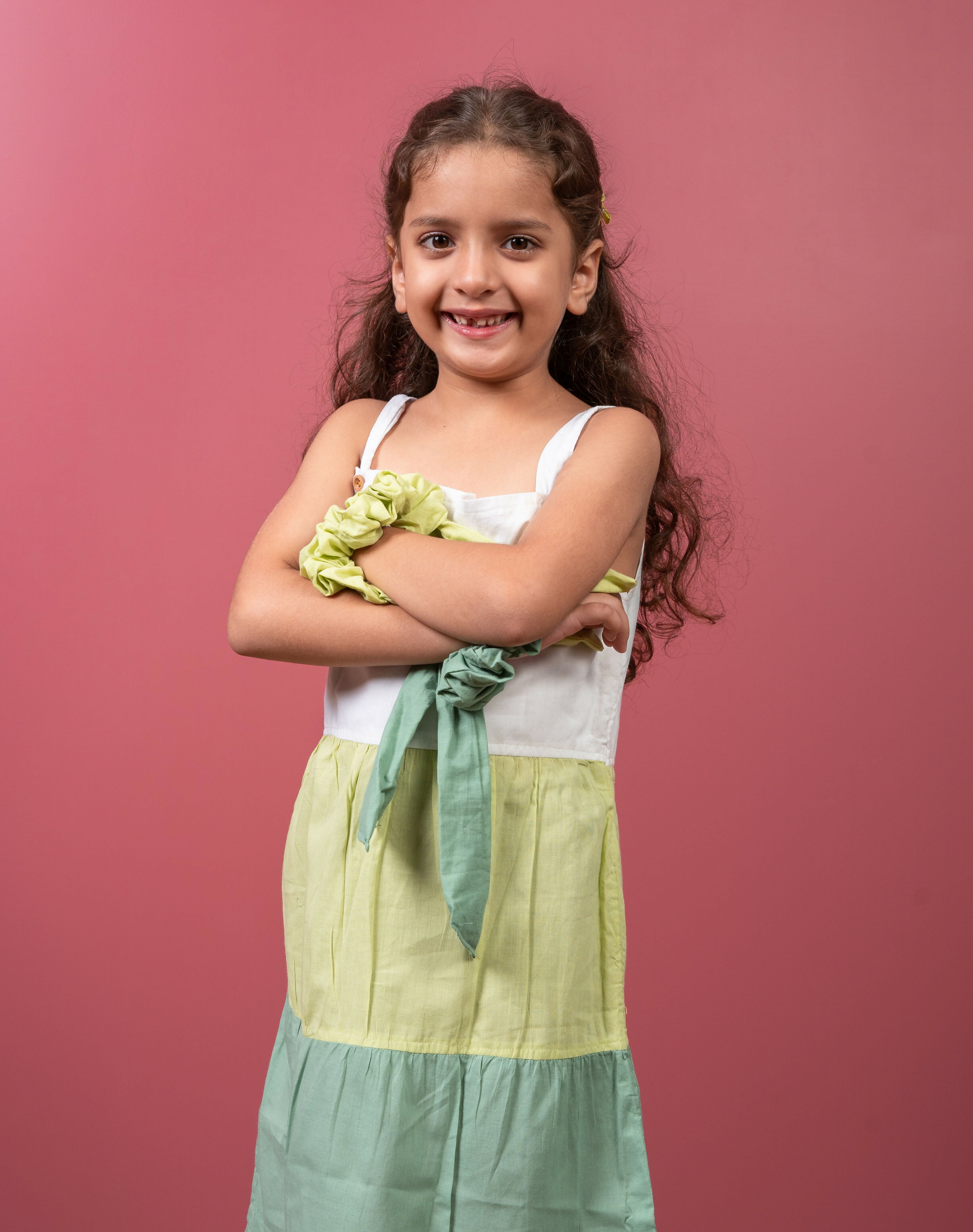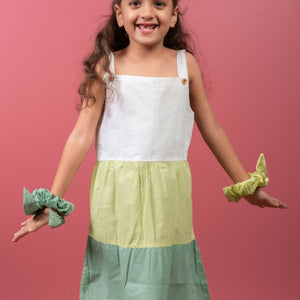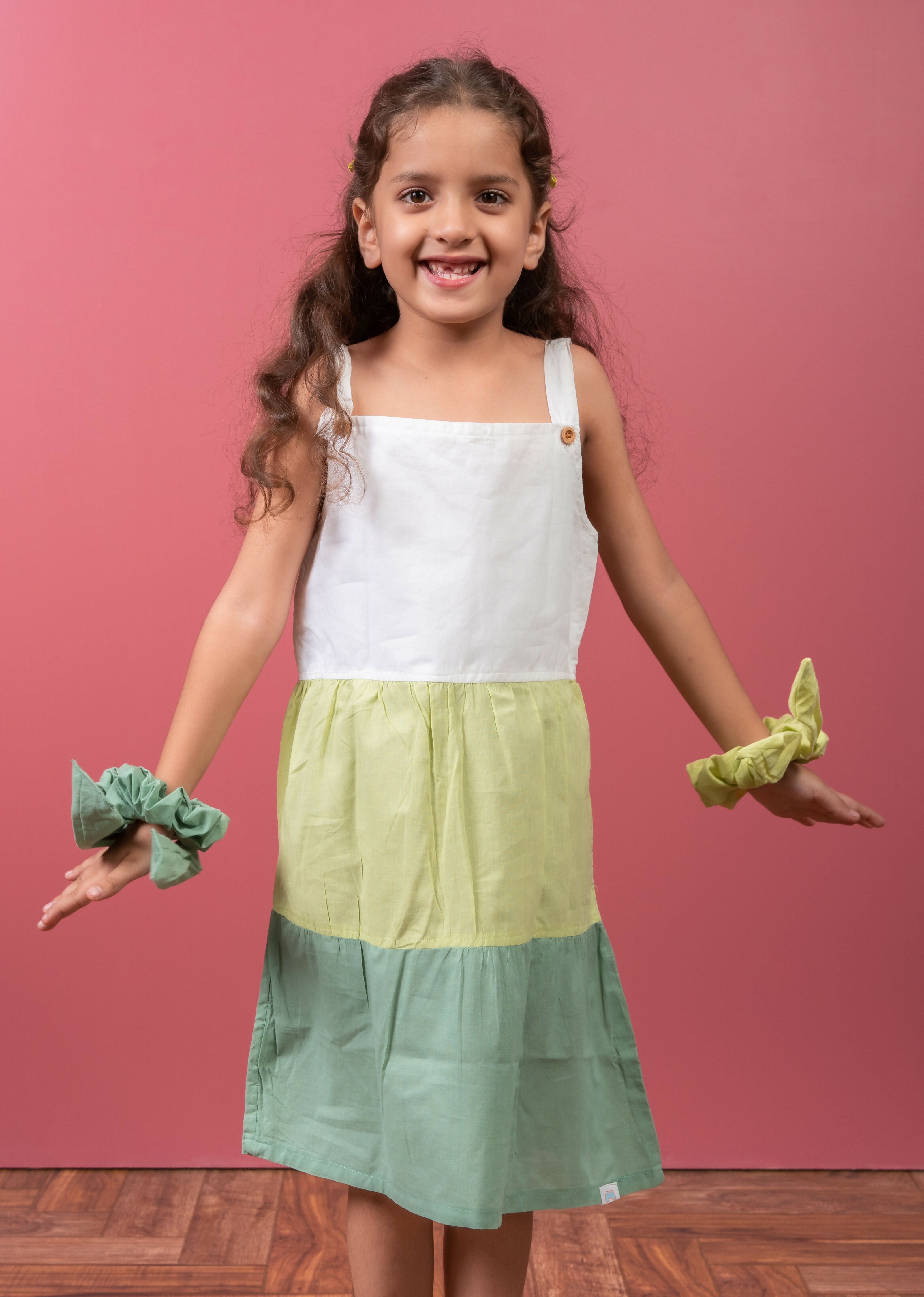Meadow Mist Color Block Dress Featuring A Refreshing Combination Of White, Green Mist, And Bay Leaf Colors. This Dress Is Adorned With Charming Wooden Buttons, Adding A Rustic Touch To Its Contemporary Design. The Harmonious Blend Of Colors Creates A Pleasing Contrast, Making It A Delightful Choice For A Range Of Occasions, From Casual Outings To Special Gatherings. Crafted With Care And Style In Mind, It Ensures Your Child Looks And Feels Their Best, All While Embodying A Sense Of Nature'S Elegance. Crafted With Care, This Dress Is Not Only Fashion-Forward But Also Incredibly Gentle On Your Child'S Skin. We'Ve Chosen The Finest Organic Cotton To Ensure A Luxuriously Soft Feel Against Your Little One'S Body.