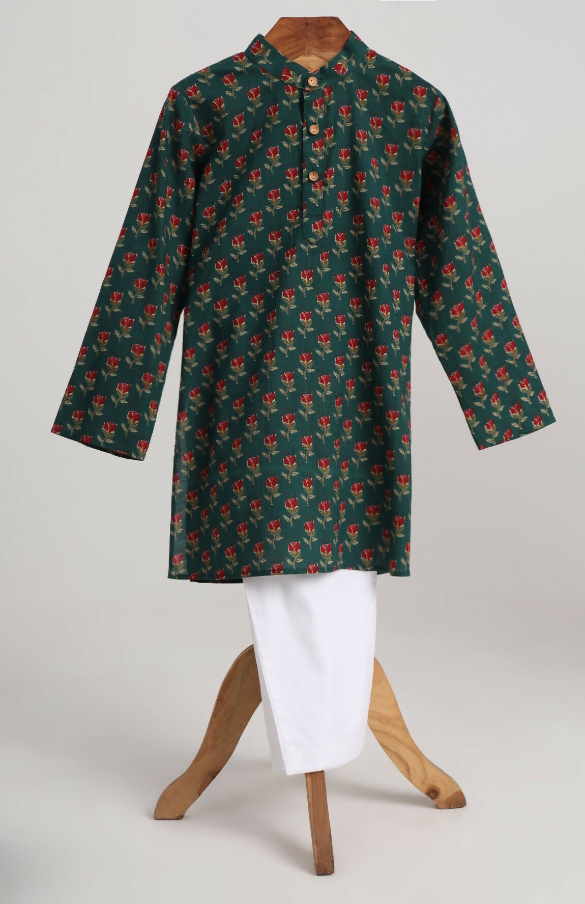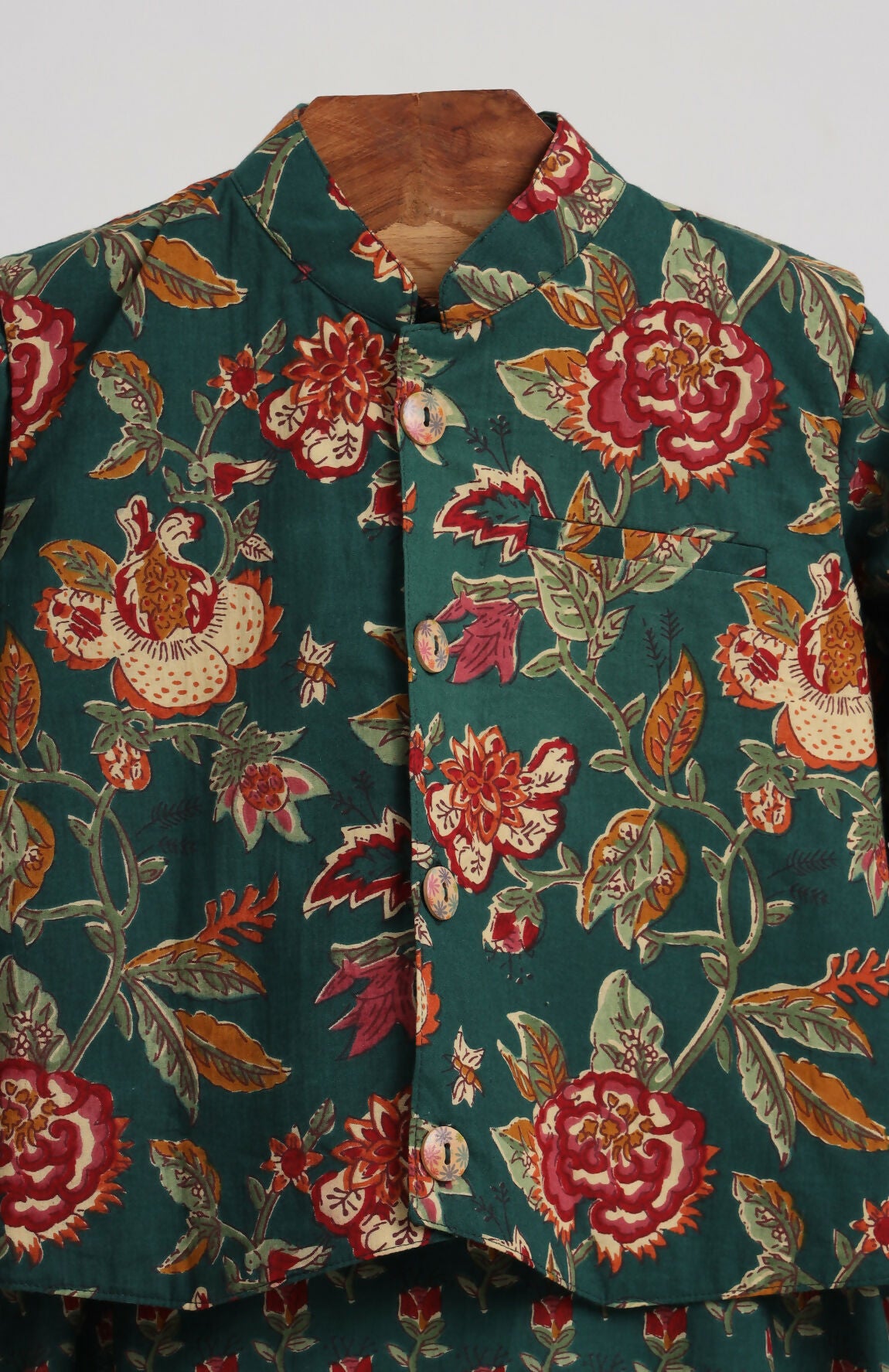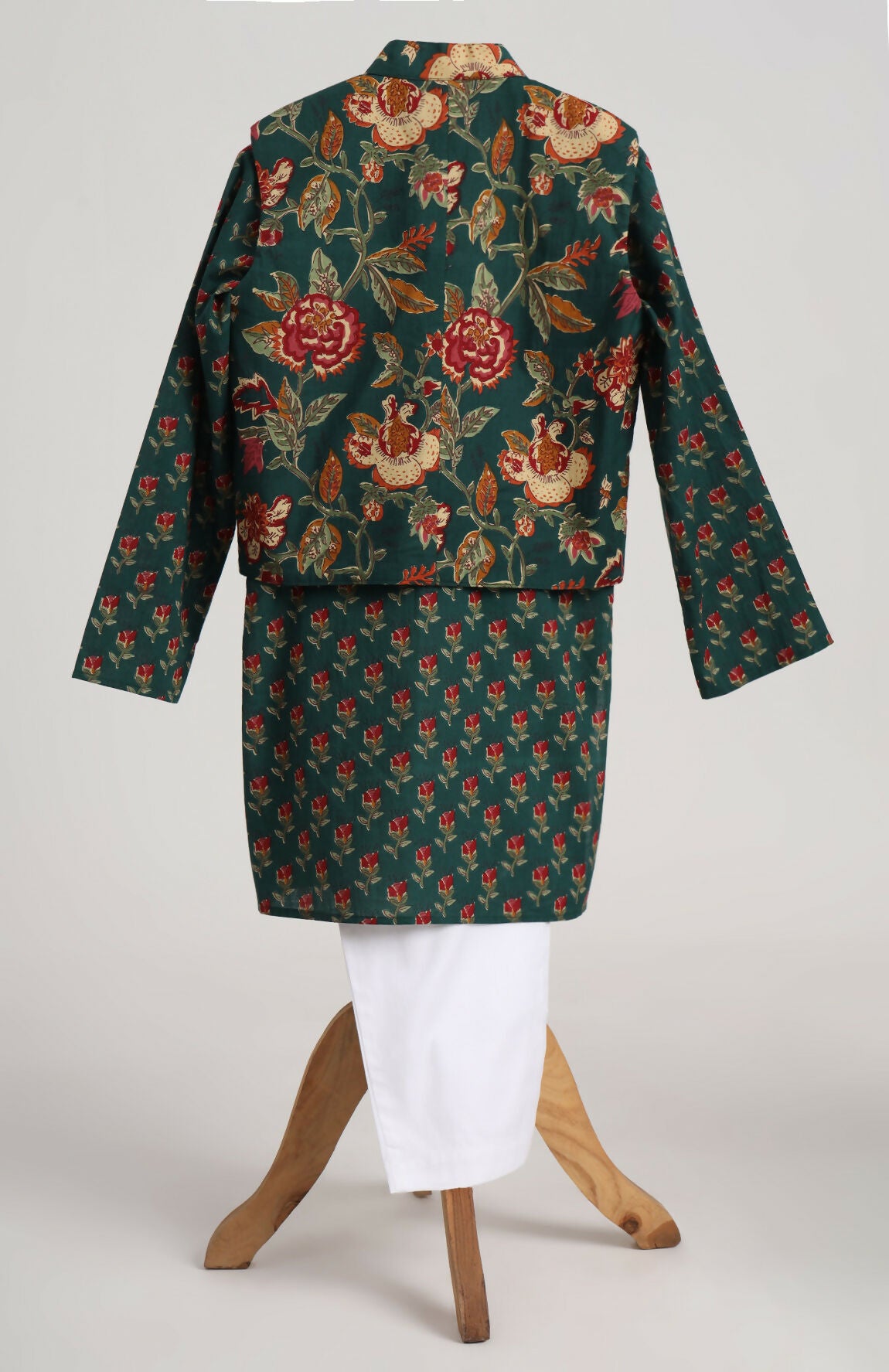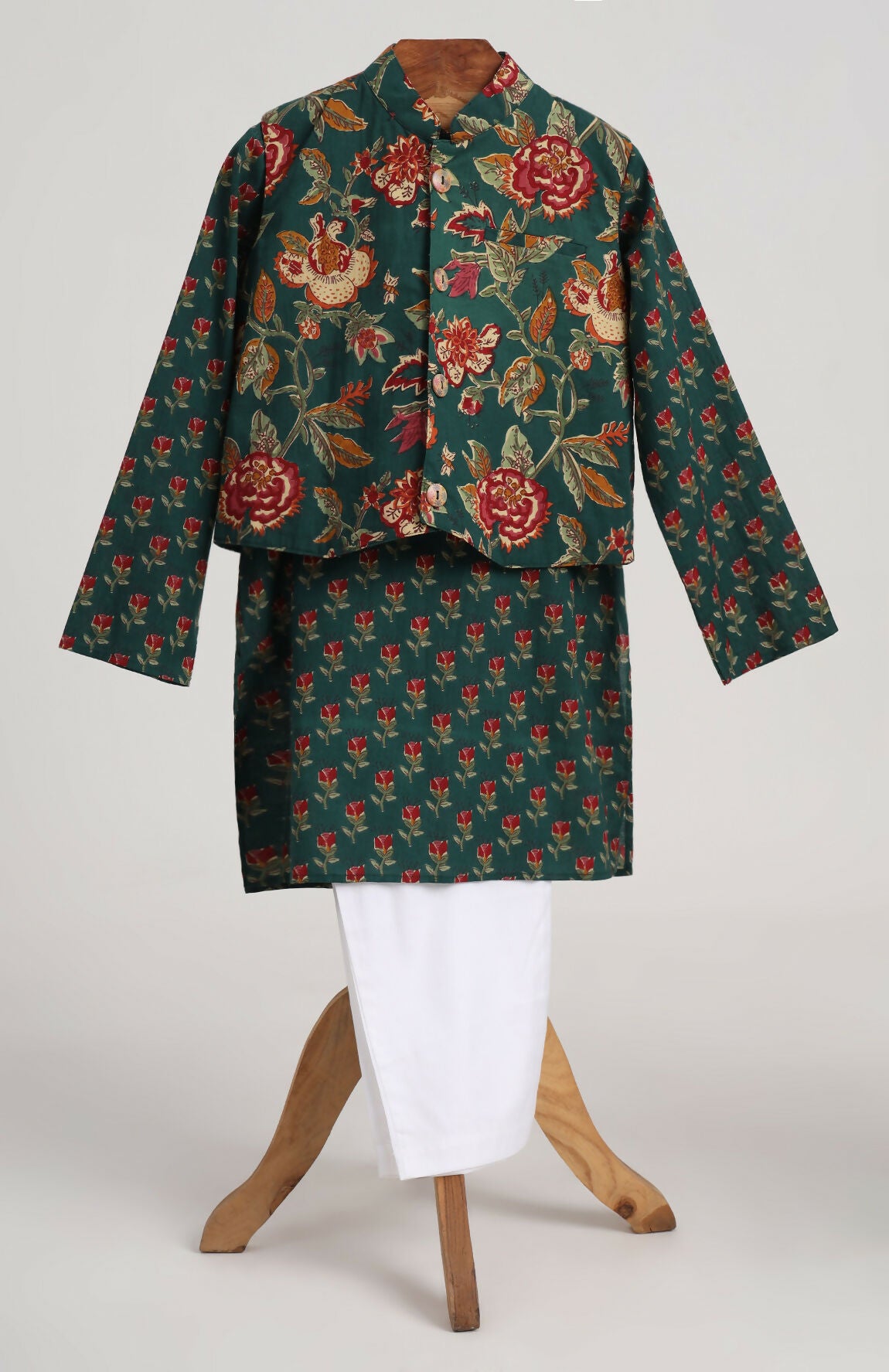 Block Printed Cotton Kurta paired with Glazed Cotton Pyjama and Floral Print Jacket