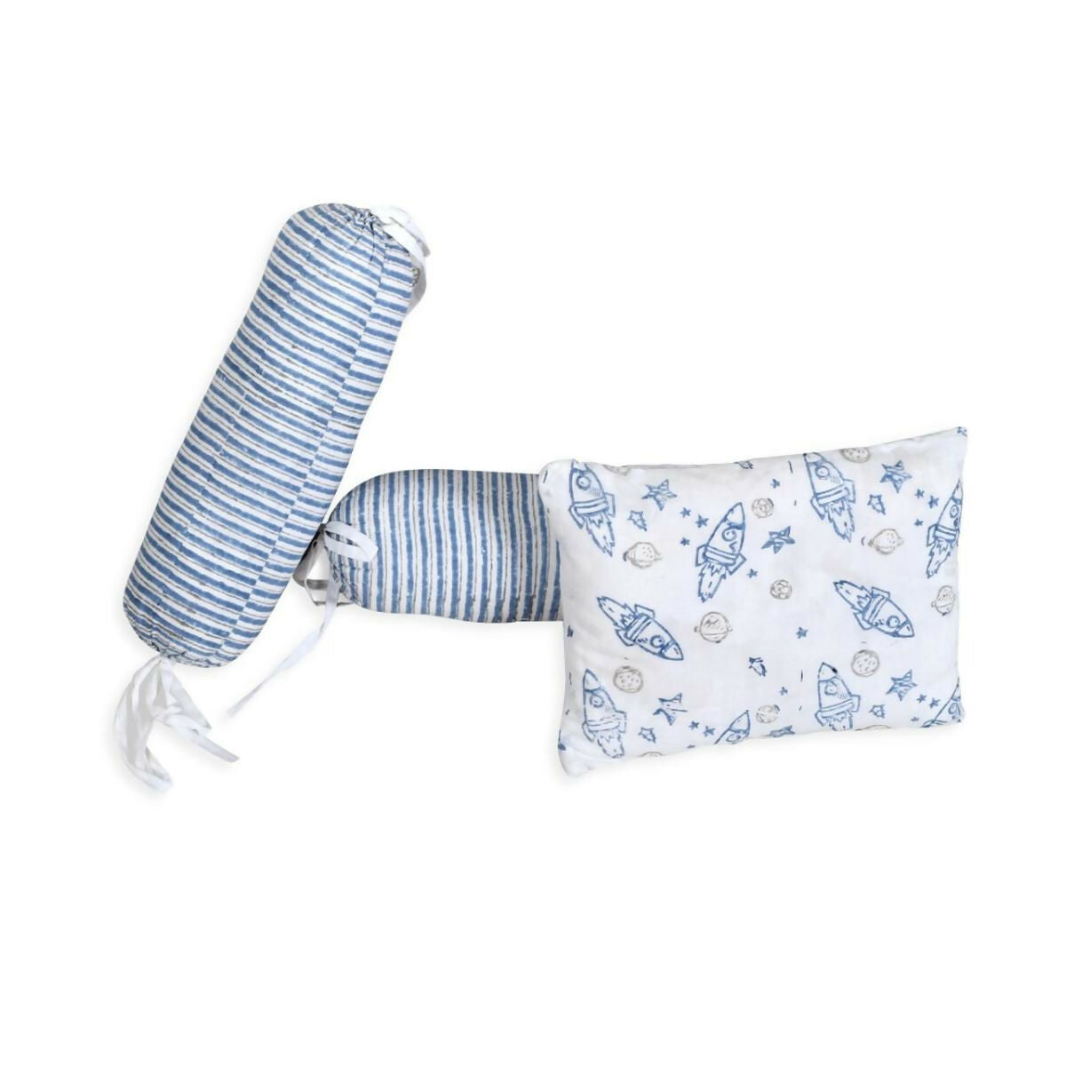 A perfect set for your little Infant. Our signature Infant Quilt with perfect companions of two Bolsters and a Pillow. The pillow and bolsters come with 100% cotton. Block printed cotton muslin, hand quilted with cotton lining. Made with 100% cotton. Breathable soft and cozy. Comes with a Rai pillow.