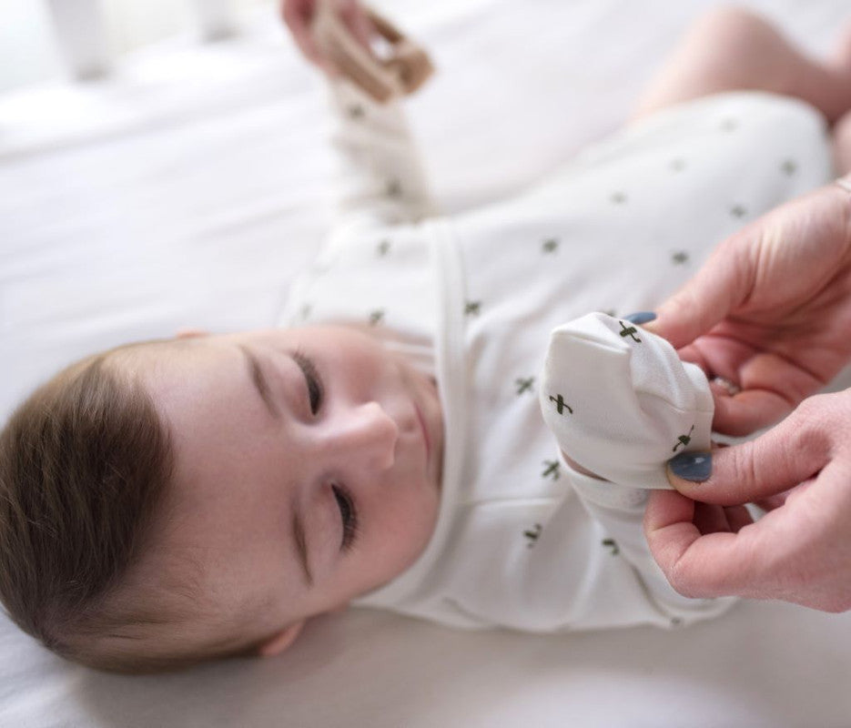 Pack of Organic Knotted Hat and Mitten to welcome your newborn into the world. Our hat knot is adjustable and mittens keeps your little tickles fingers safe.