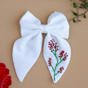 Introducing a big statement bow in classic white with a touch of floral embroidery elegance making it perfect for special occasions, photoshoots, or gifting to your loved one.