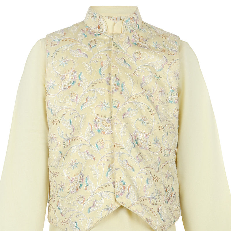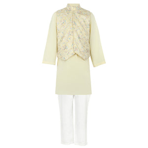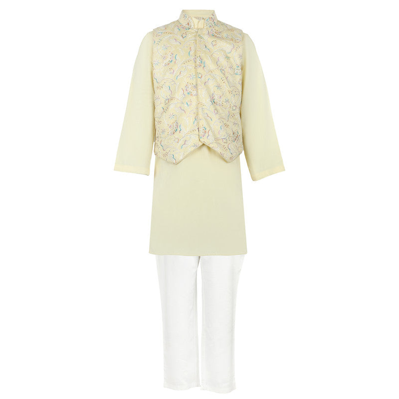 Effortlessly elegant yellow kurta set, complemented by a Nehru jacket featuring intricate, multicolored embroidery. A refined choice for any special celebration.
