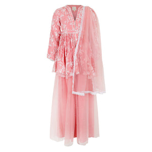 Elegant pink sharara suit featuring an embroidered peplum top with fine white lace trim. The flared net trouser and flowing dupatta create a graceful, feminine silhouette.