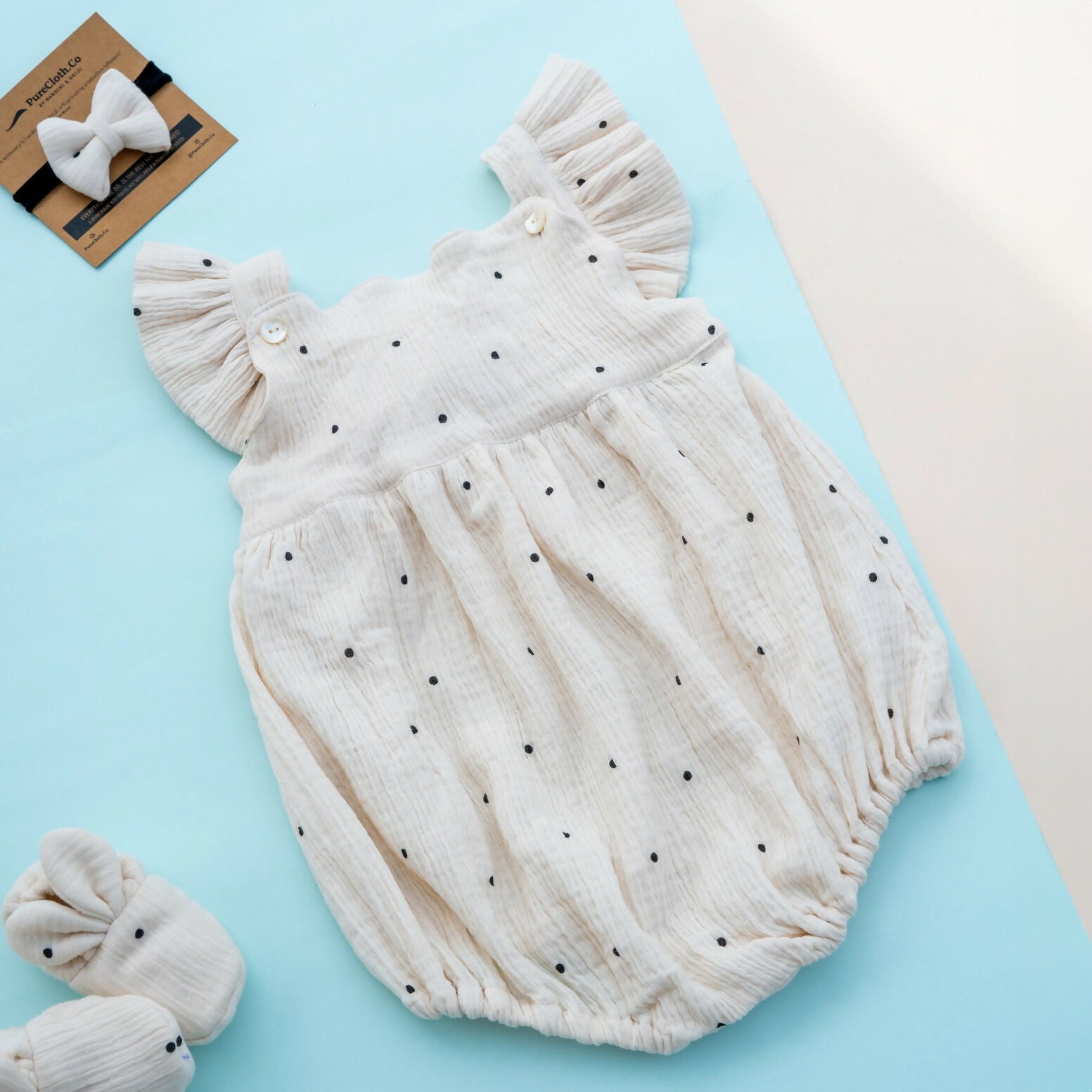 Made from 100% pure cotton gauze, this handcrafted baby romper is the perfect blend of comfort, style, and sustainability. Soft on delicate skin and lightweight for all-day wear, it’s designed to make your little one feel cozy and free. Shop matching handmade accessory and booties, making it an ideal choice for baby photoshootsspecial occasions, or as a thoughtful newborn gift.