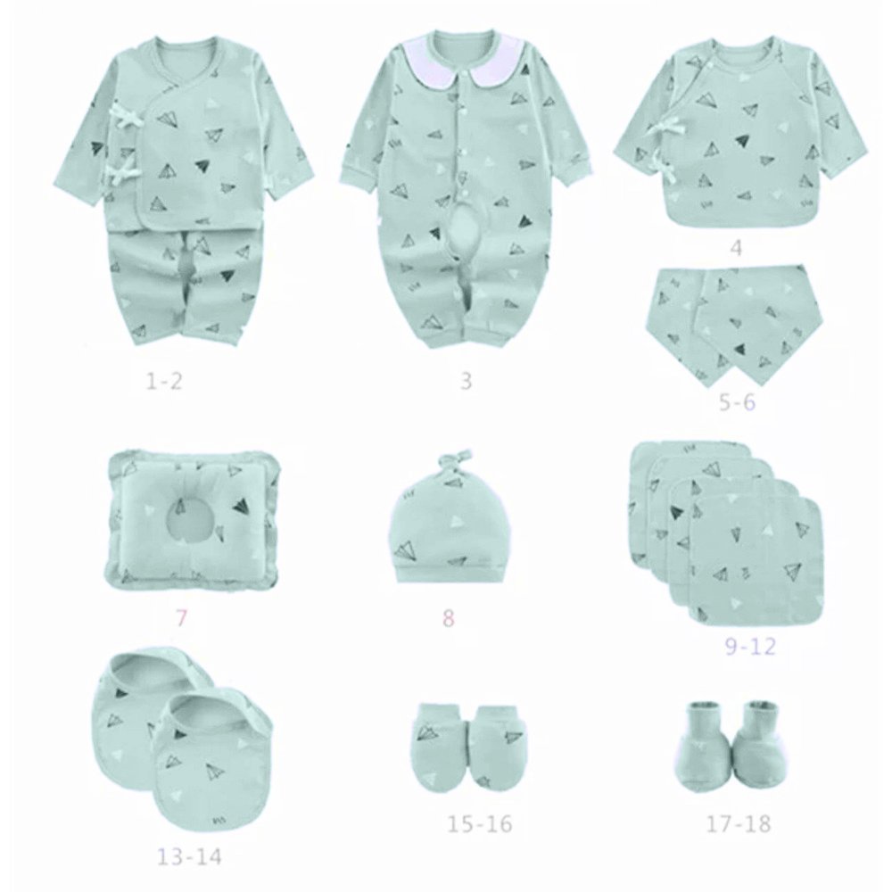 • It constitutes of the following products 1 Baby Pillow, 1 Swaddle with Hood and Belt, 1 Diaper Changeable Romper,1 Full Sleeves Night Suit Set (1 Shirt & 1 Pant), 2 Full Sleeves Vest T-Shirt, 1 Diaper Changeable Pant, 1 Pair of Booties, 1 Pair of Mittens; 1cap, 4 Napkins, 2 Bandana Bibs, 2 Feeding Bibs