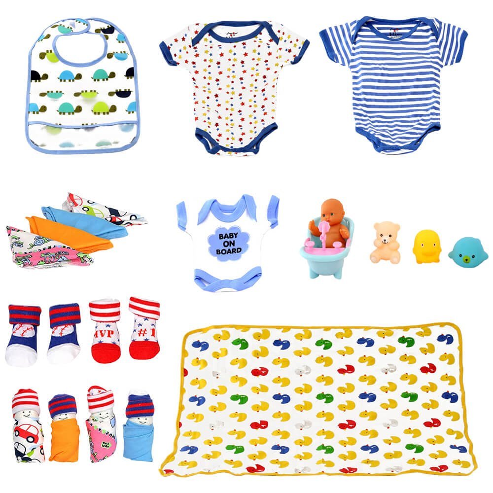 - It constitutes the following products : 1 Feeding Bib, 4 Diapers, 2 Pairs of Socks, 4 Napkins, 1 Bedsheet, 2 Onesies, 4 Bath Toys, 1 baby on board car hanger, 1 Kid Room Decor Storage stand
