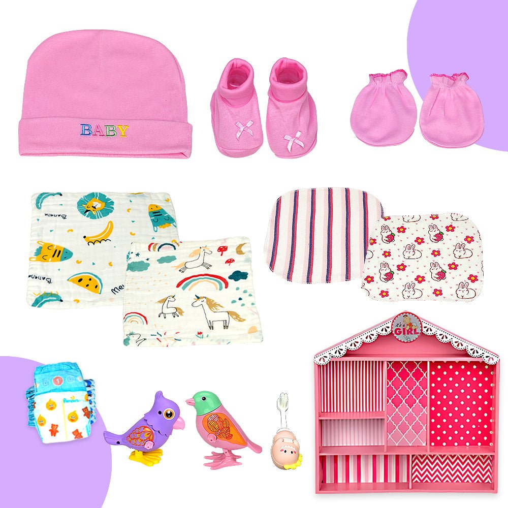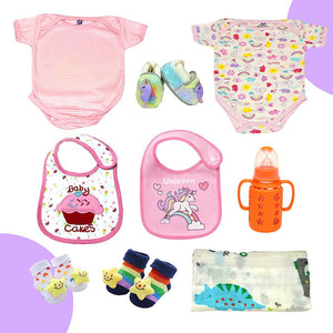 - It constitutes the following products : 2 Onesies (Baby clothes), 1 Pair of Booties,2 Feeding Bib , 1 Milk Glass bottle , 2 Pairs of 3D Socks,1 Cotton Swaddle,. 1 Newborn Cap,1 Pair of Mittens,1 Pairs of Socks , 2 soft Muslin Napkins , 2 cotton napkins , 1 Diaper , 2 Bath toys, 1 Soft Toothbrush ,1 Doll house Wooden Storage Shelf