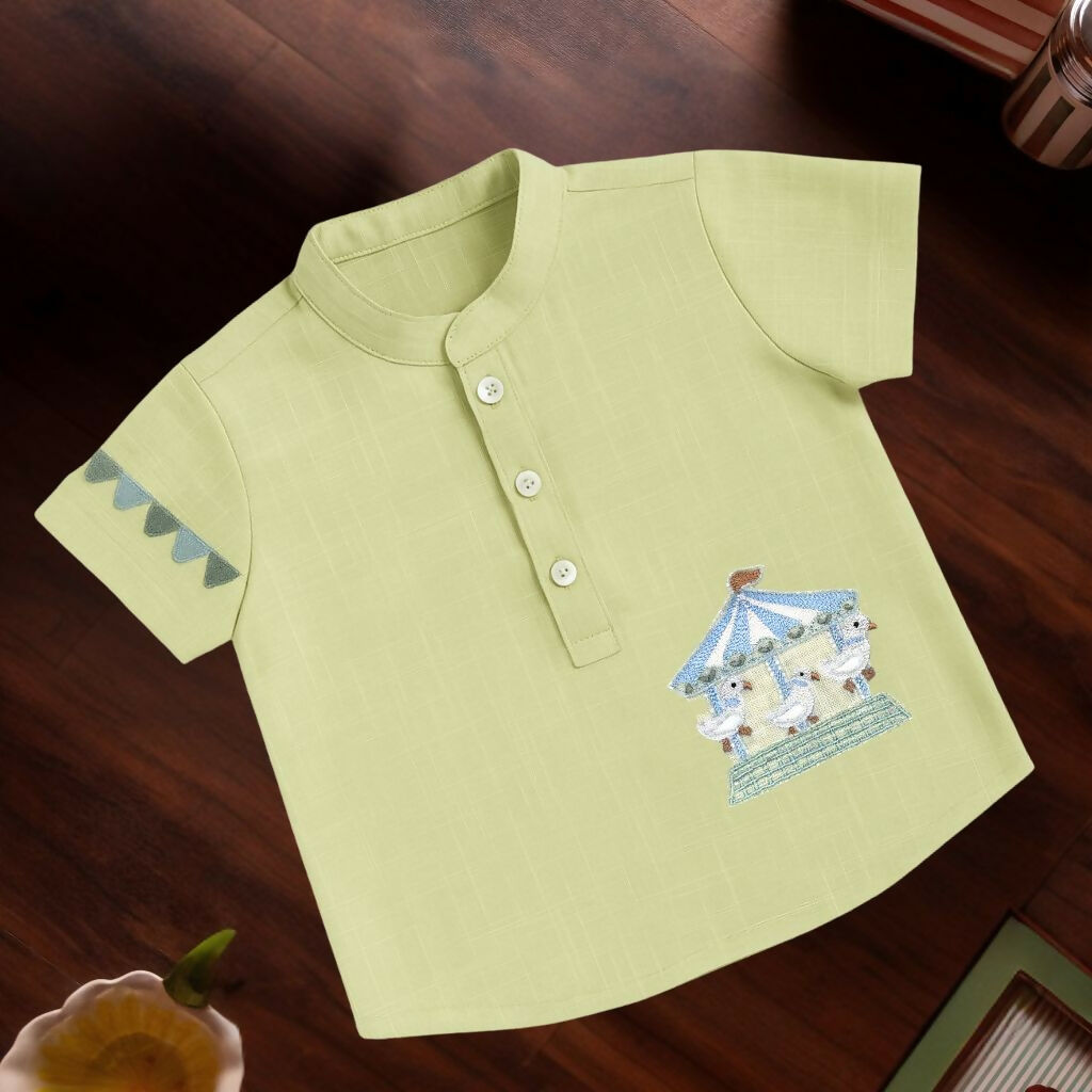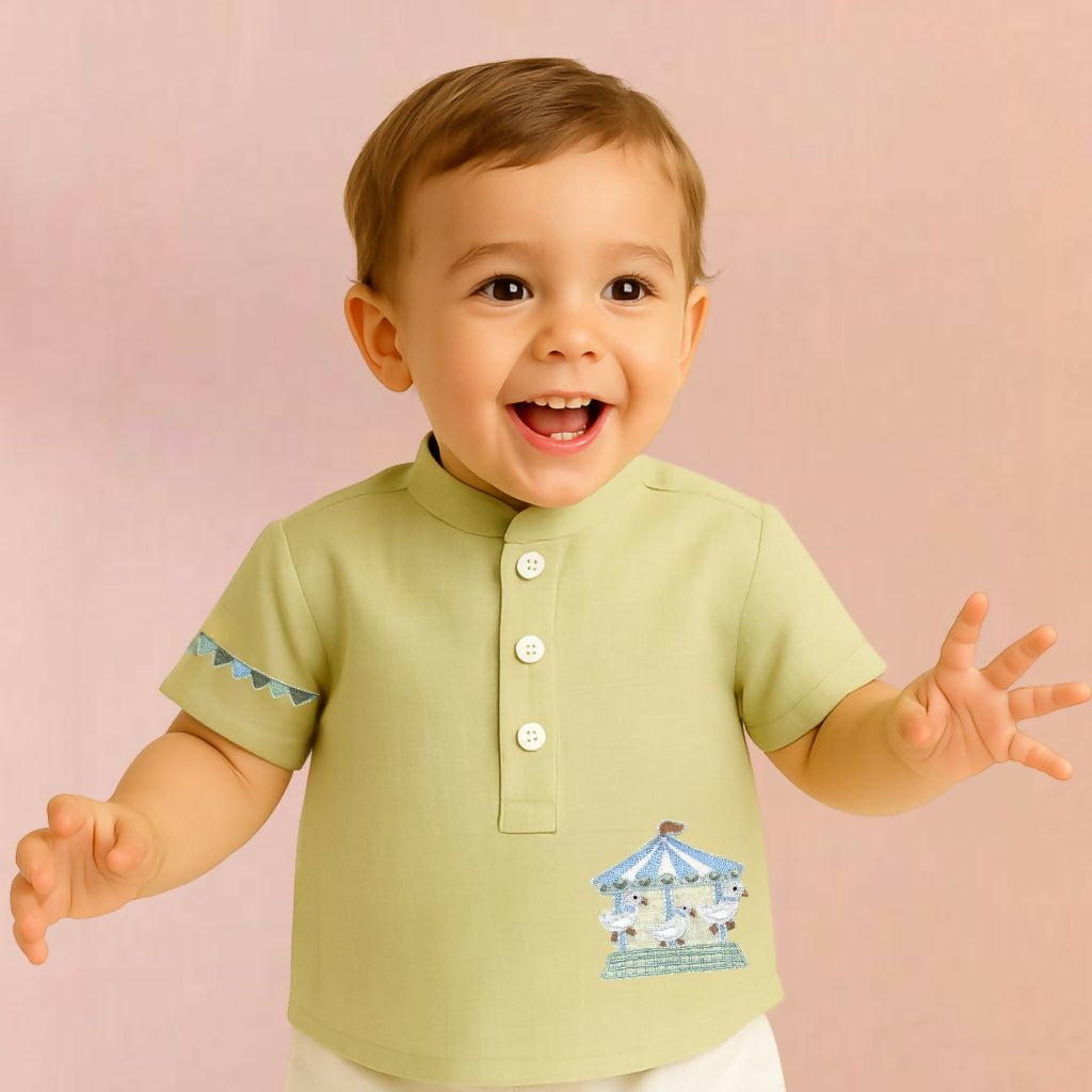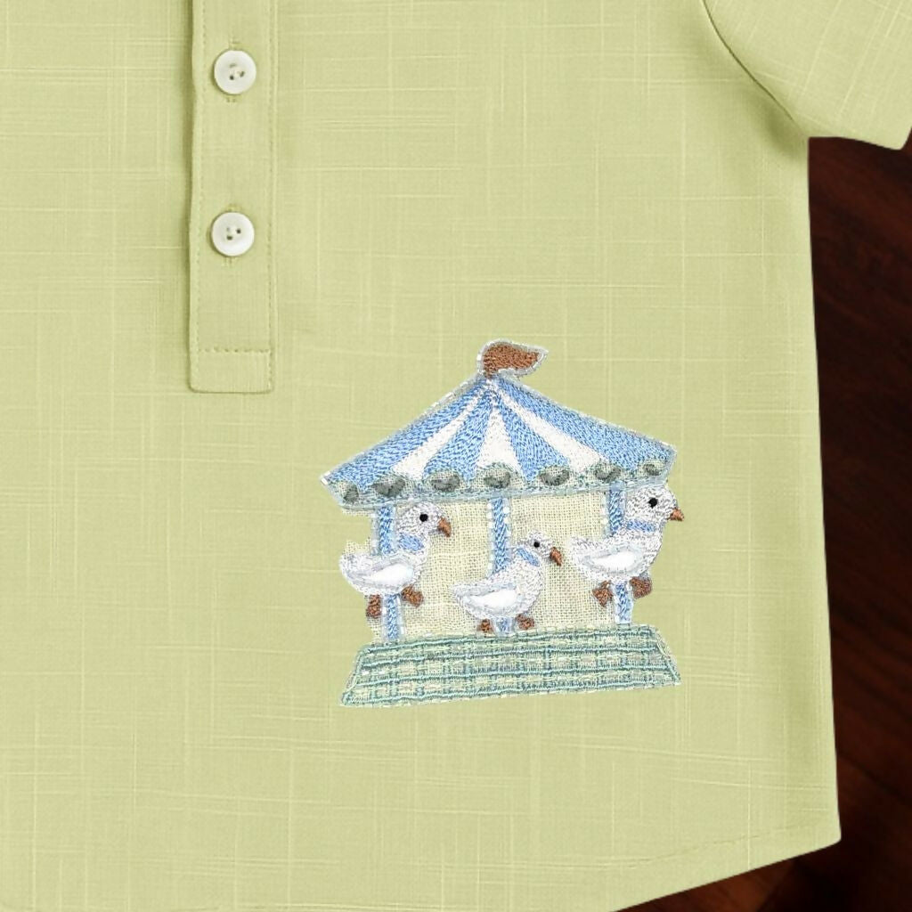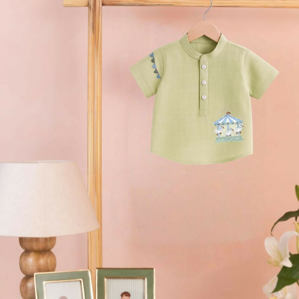 Whimsical charm. A pastel green shirt with carousel & bunting embroidery, designed to bring joy and playfulness to your little one’s wardrobe.